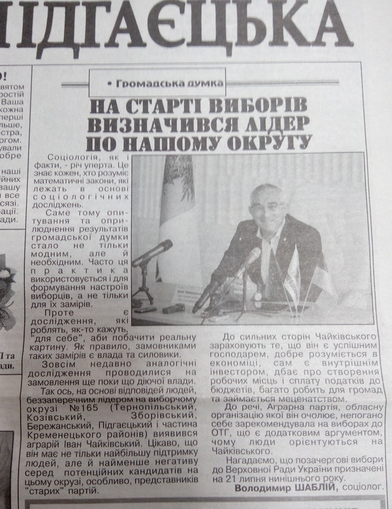 А ще у трьох газетах від 14 червня спостерігачі ОПОРИ виявили публікацію про кандидата в депутати в одномандатному виборчому окрузі №165 Івана Чайківського «На старті виборів визначився лідер нашого округу». Автором повідомлення зазначений соціолог Володимир Шаблій.