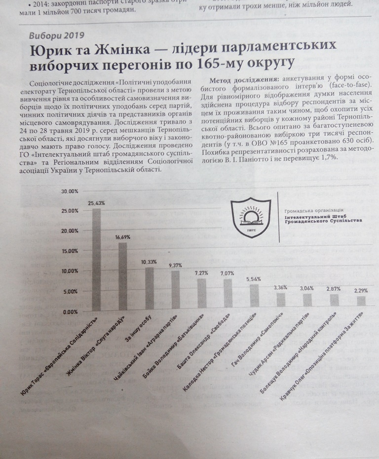 В одній із газет за 14 червня опублікована статистика соціологічних досліджень електоральних уподобань мешканців Тернопільщини із назвою «Юрик та Жмінка – лідери парламентських виборчих перегонів по 165- му округу».