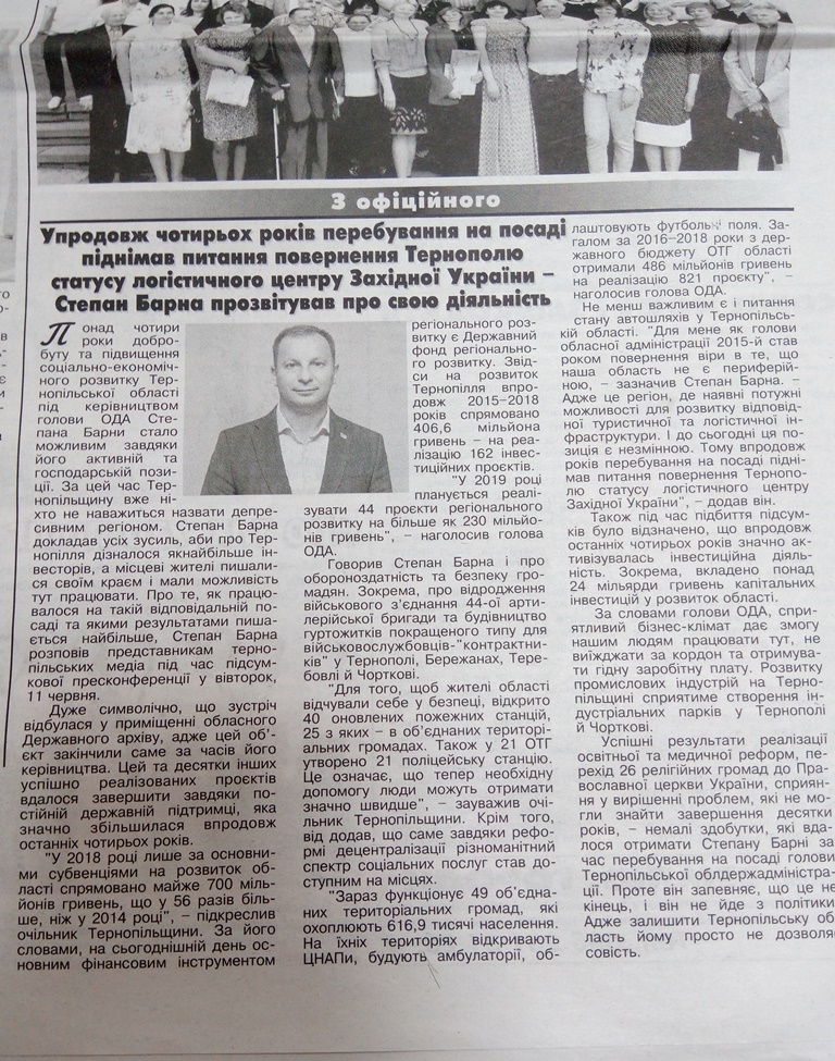 Поряд з тим, у семи районних газетах області від 14 червня спостерігачі ОПОРИ зафіксували статтю однакового змісту з різними заголовками як «Степан Барна: «Тернопільщина – регіон потужних можливостей» або «Упродовж чотирьох років перебування на посаді піднімав питання повернення Тернополю статусу логістичного центру Західної України- Степан Барна прозвітував про свою діяльність». У ній йдеться про позитивні здобутки Барни на його колишній посаді.