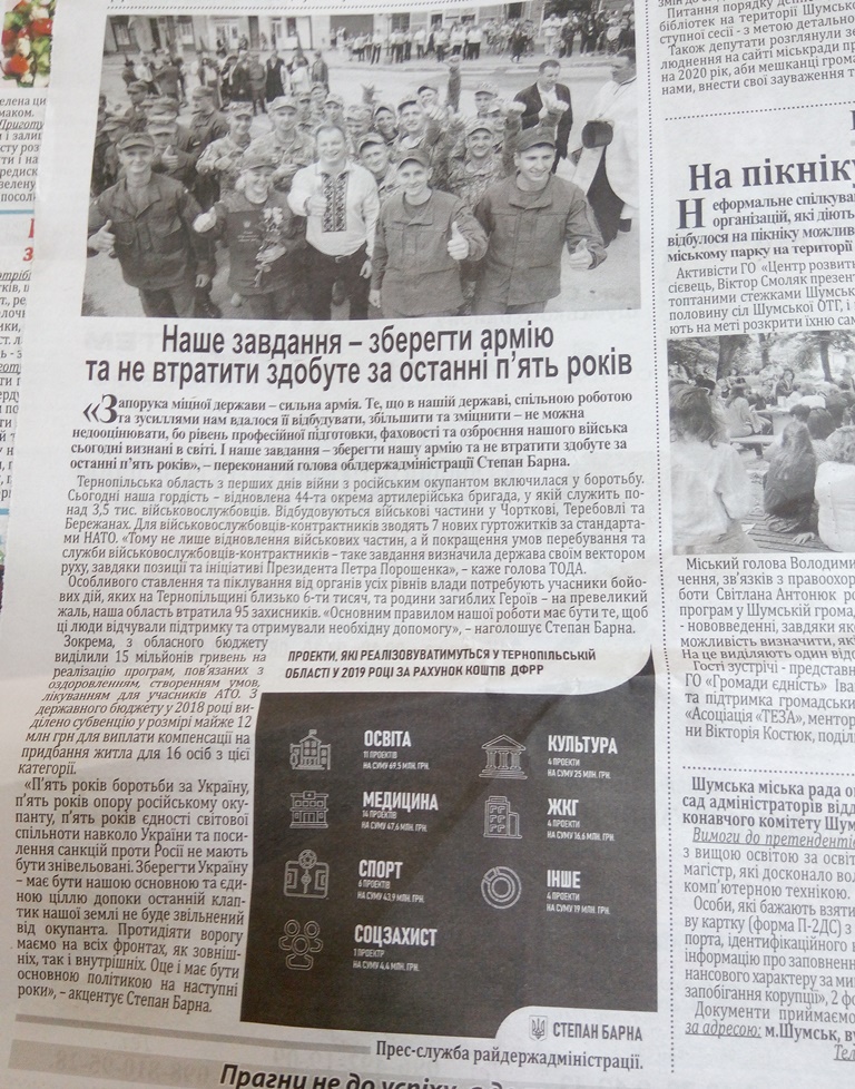 У п’яти районних газетах від 7 червня була зафіксована стаття з різними назвами «Степан Барна «Збереження України – наша основна і єдина ціль» або «Степан Барна: «Наше завдання – зберегти армію та не втратити здобуте за останні п’ять років». У ній йшлося про те, що на оздоровлення учасників АТО з обласного бюджету виділено 15 млн гривень.