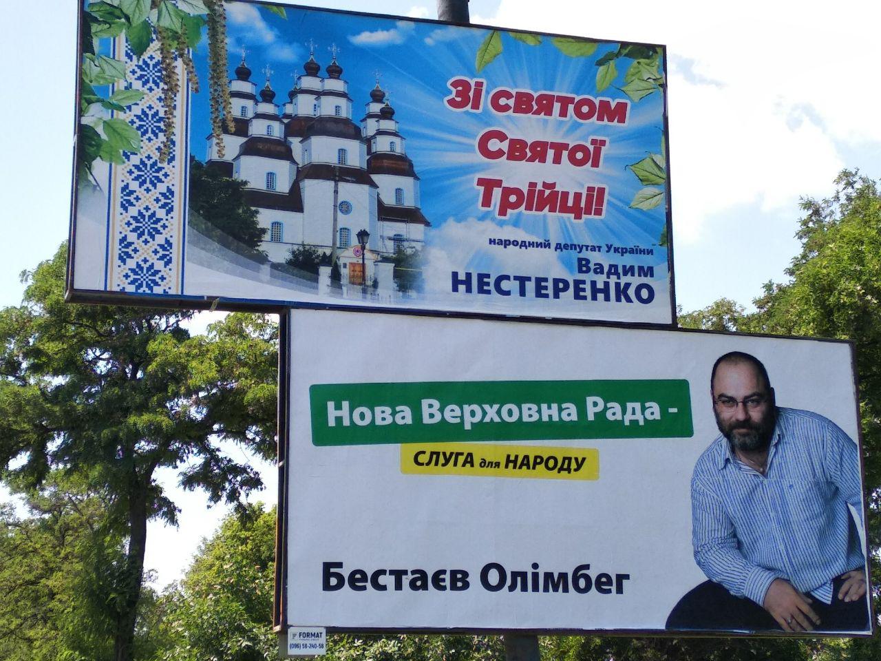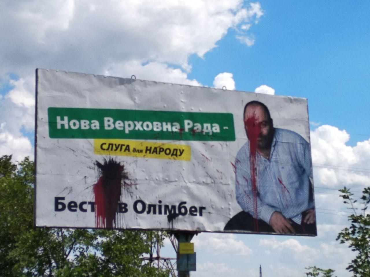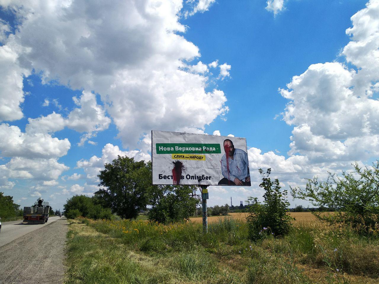 На білбордах, розташованих як в самому місті Новомосковськ так і за містом, а також в Магдалинівському районі, що також є частиною 38 виборчого округу зображено фотографію чоловіка та напис «Нова Верховна Рада – слуга для народу. Бестаєв Олімбег».