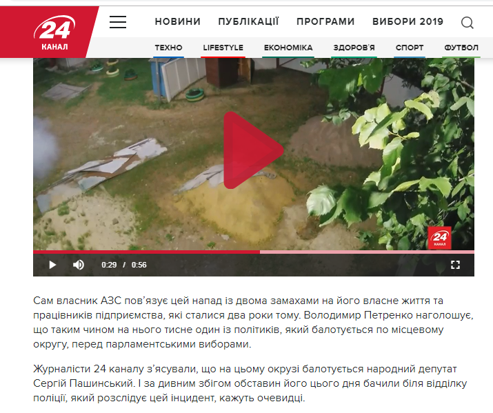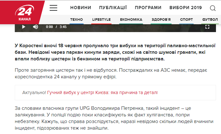 «У Коростені вночі 18 червня пролунало три вибухи на території паливно-мастильної бази. Невідомі через паркан кинули заряди, схожі на світлошумові гранати, які впали поблизу цистерн із бензином на території підприємства... Сам власник АЗС пов’язує цей напад із двома замахами на його власне життя та працівників підприємства, які сталися два роки тому. Володимир Петренко наголошує, що таким чином на нього тисне один із політиків, який балотується по місцевому округу, перед парламентськими виборами. Журналісти 24 каналу з’ясували, що на цьому окрузі балотується народний депутат Сергій Пашинський. І за дивним збігом обставин його цього дня бачили біля відділку поліції, який розслідує цей інцидент, кажуть очевидці»,  – йдеться у тексті матеріалу на сайті.