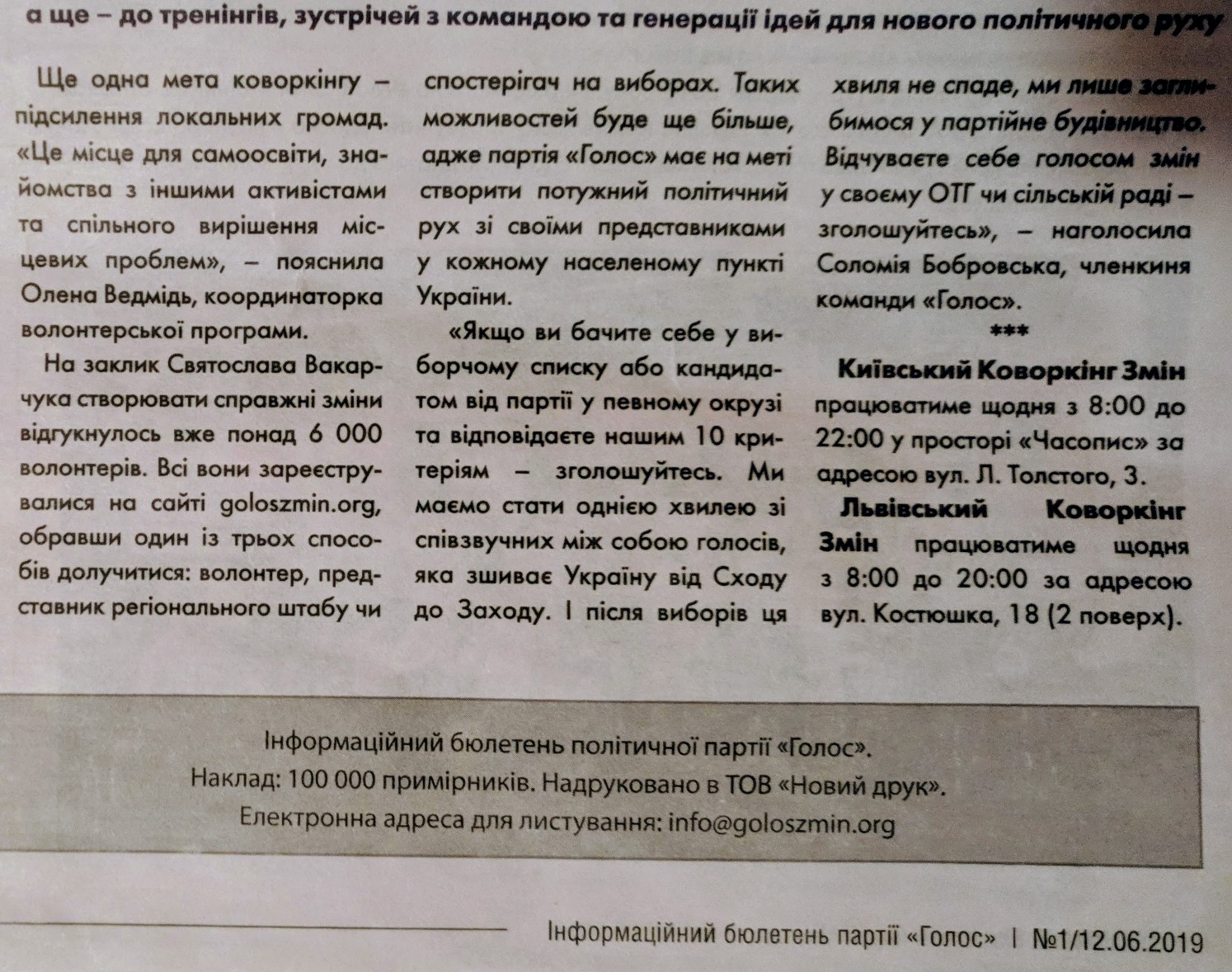 Нагадаємо, список партії «Голос» був зареєстрований Центральною виборчою комісією 19 червня 2019 року. Таким чином, ймовірно, наклад інформаційного бюлетеню було надруковано не за кошти виборчого фонду партії.