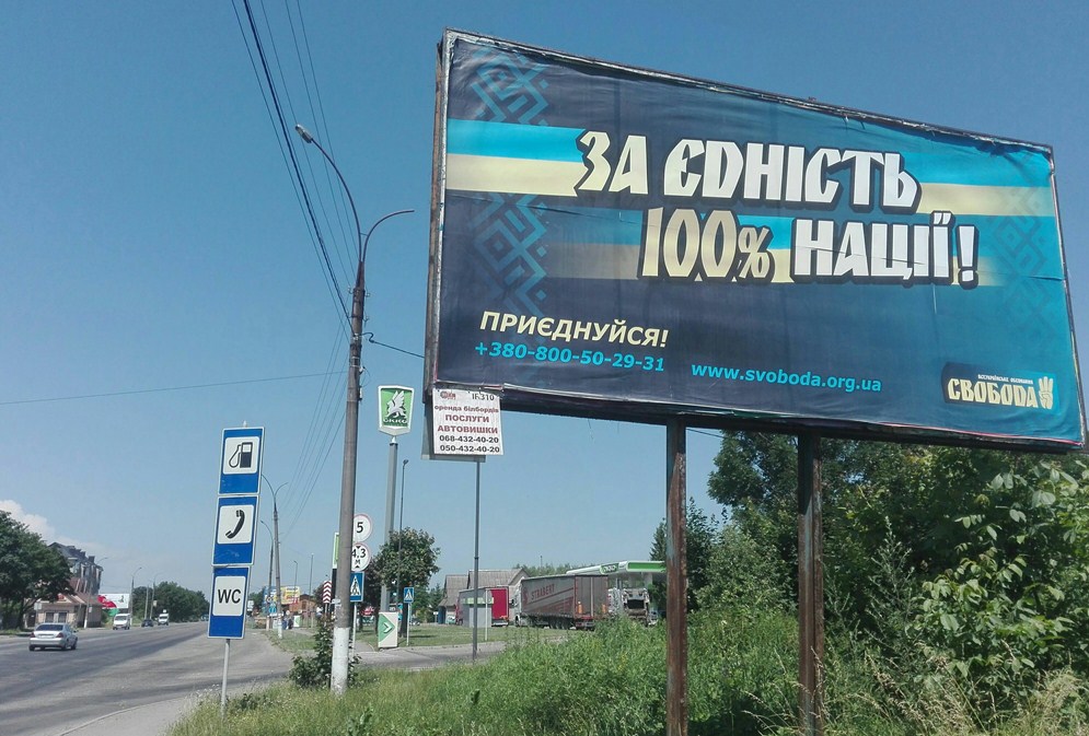 У Калуші, Коломиї та Івано-Франківську спостерігачі виявили оформлені неналежним чином білборди із написом «За єдність 100% нації. Приєднуйся!» із агітацією за ВО «Свобода». У Івано-Франківську зафіксували сітілайти з агітацією за політичну партію «Голос» та білборди з агітацією «Радикальної партії». На агітаційних матеріалах цих партій не було вихідних даних, як того вимагає Закон «Про вибори народних депутатів України» (ч. 23 ст. 74 Закону). А саме: відомостей про замовника друкованих передвиборних агітаційних матеріалів, установу, яка здійснила друк, тираж, інформації про осіб, відповідальних за випуск.