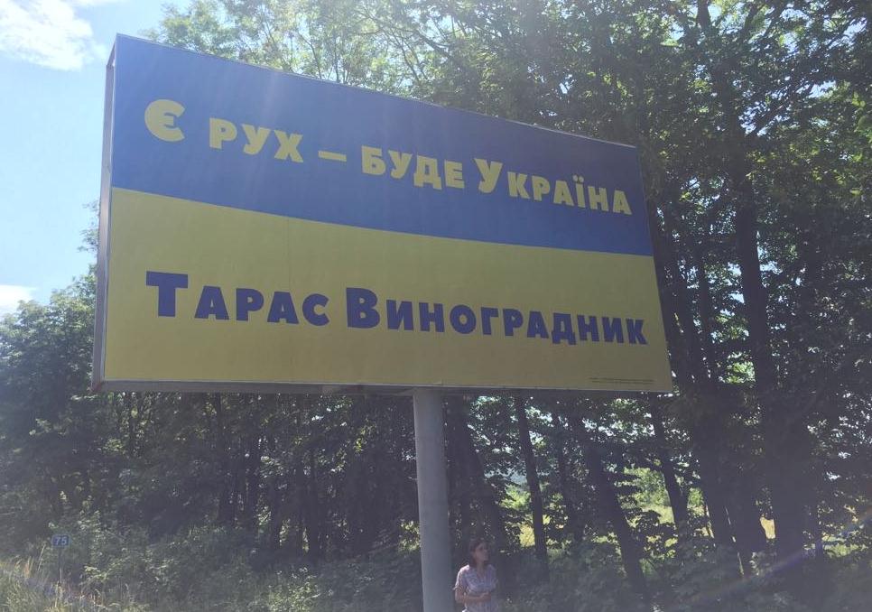 Також у Калуші , Болехові, Надвірній та Івано-Франківську спостерігачі зафіксували агітаційні матеріали кандидата у депутати по округу № 86 Тараса Виноградника, розміщені ймовірно не за кошти виборчого фонду. Це білборди із написом «Є РУХ- буде Україна. Тарас Виноградник». На агітації Виноградника були необхідні вихідні дані, однак станом на 20-21 червня спостерігачам не було відомо про створення його виборчого фонду.