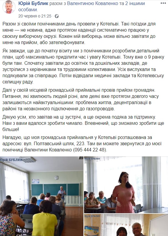 Так, Бублик провів 20 червня в Котельві зустріч з виборцями, а також зустрівся з керівниками та колективами освітніх та медичних закладів.