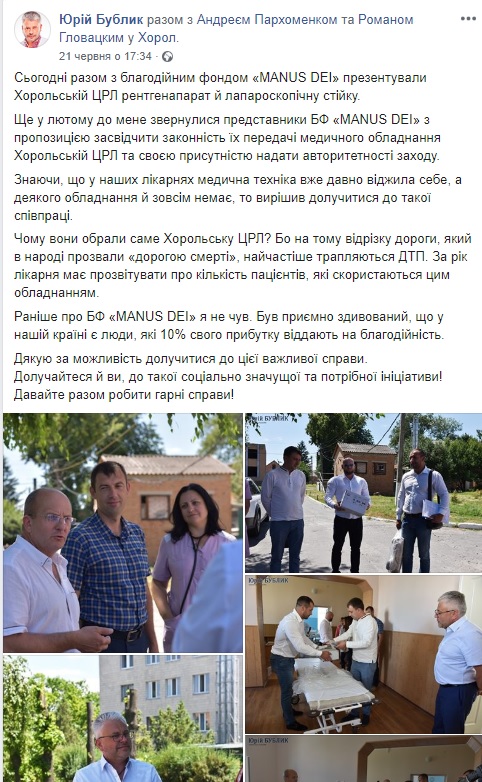 21 червня разом з благодійним фондом MANUS DEI презентував Хорольській ЦРЛ рентгенапарат й лапароскопічну стійку. За словами Бублика кошти на апаратуру були виділені БФ, а він виступав в цьому заході на запрошення фонду, щоб «надати авторитетності заходу».