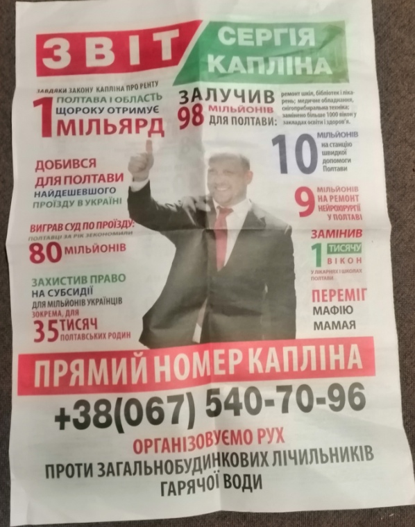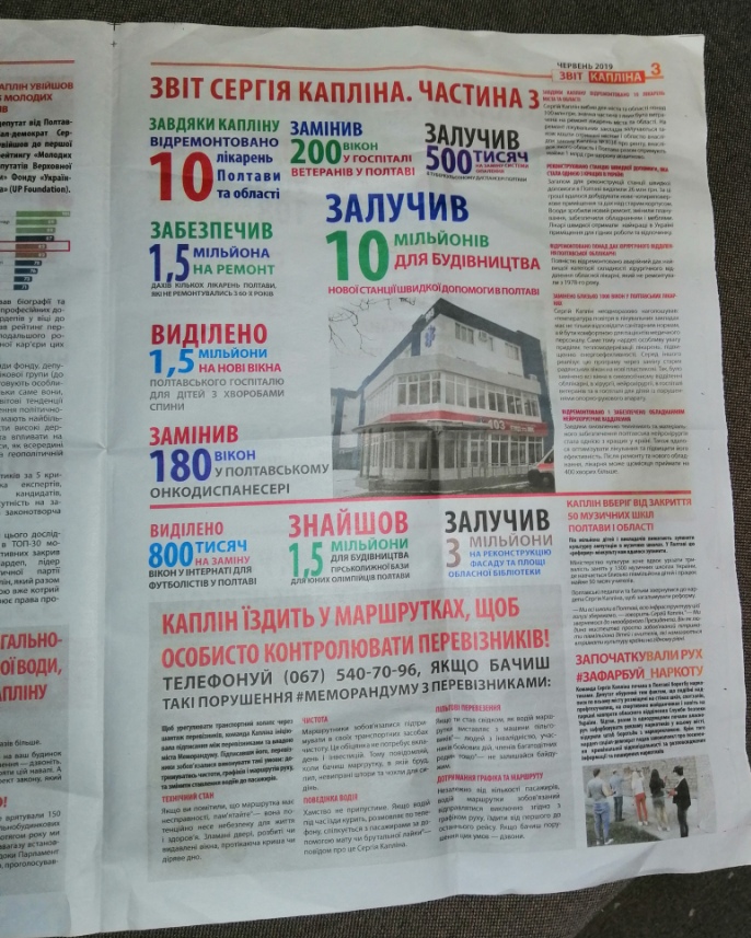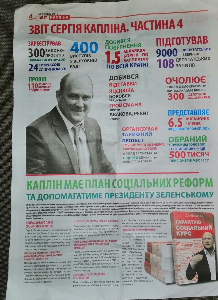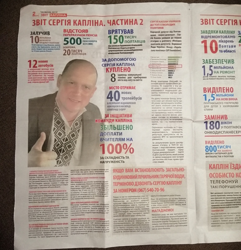 Під час зустрічей він також розповсюджує агітаційну газету «Звіт Сергія Капліна», в якій відсутні вихідні дані, що може мати ознаки порушення виборчого законодавства.