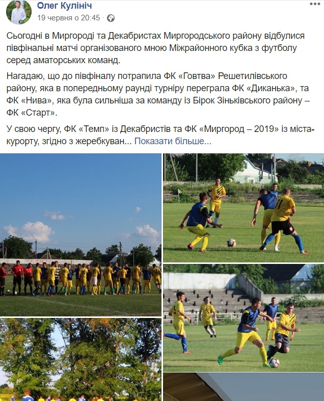 З семи зареєстрованих кандидатів – самовисуванців Віктора Костенка, Світлани Кравчук, Олега Кулініча, Євгенія Мартосенка, Оксани Мацак, Анатолія Нелюби, та представника «Свободи» Анатолія Ханка, певну активність має діючий народний депутат від округу Олег Кулініч. Так, він організував футбольний турнір серед аматорських команд, фінал якого пройде 28 червня в Шишаках.