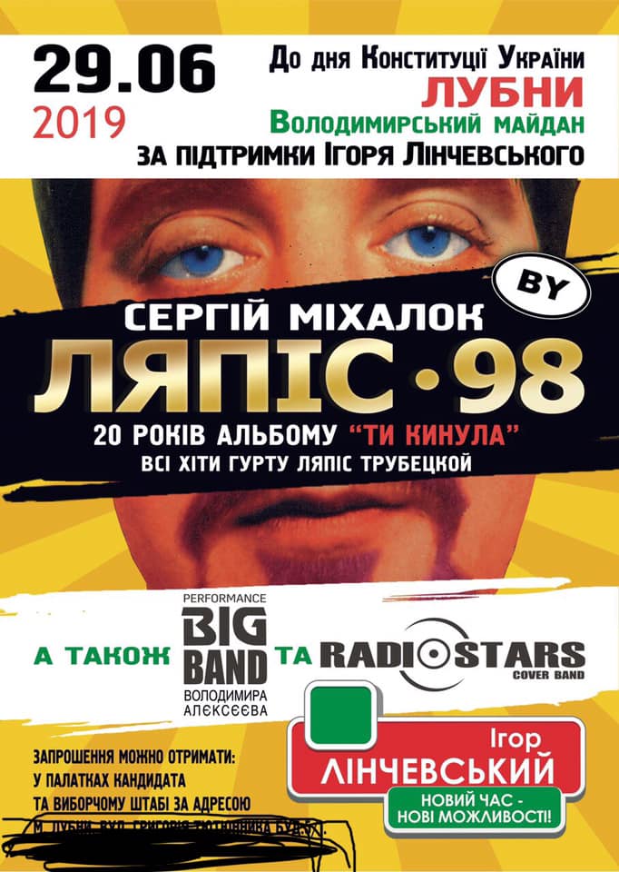 Також кандидат організовує концерт до Дня Конституції в Лубнах за участі гурту «Ляпіс-98», котрий відбудеться 29 червня. Концерт є безкоштовним, проте за повідомленням на сторінці Громадської приймальні Ігоря Лінчевського прохід у фанзону буде за запрошенням, які можна отримати в агітаційних наметах.