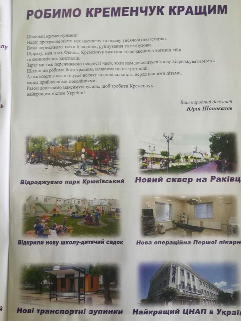 Округ має поки найбільше зареєстрованих кандидатів в межах Полтавщини – 14 (Тетяна Алєксієнко, Сергій Гамза, Валентина Гордєєва, Віталій Дедюрін, Ірина Дроздова, Ростислав Зауральський, Костянтин Красовський, Кирило Кузьмін, Сергій Мазур, Геннадій Музика, Оксана Піддубна, Олег Савченко, Ігор Чадюк та Юрій Шаповалов). Серед них спостерігачами ОПОРИ зафіксована активність лише збоку Шаповалова. По місту Кременчук розповсюджують журнал «Апостроф» під назвою «Робимо Кременчук кращим», де розповідається про досягнення Юрія Шаповалова як народного депутата щодо благоустрою Кременчука.