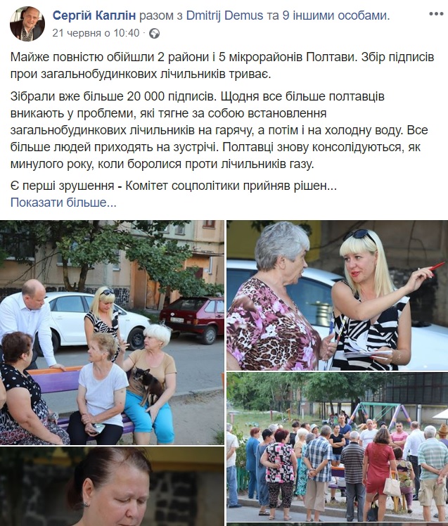 Найбільшу активність в межах передвиборчої кампанії наразі проявляє Сергій Каплін. Як повідомляють спостерігачі ОПОРИ він активно проводить зустрічі щодо збору підписів проти встановлення загальнобудинкових лічильників в Полтаві.
