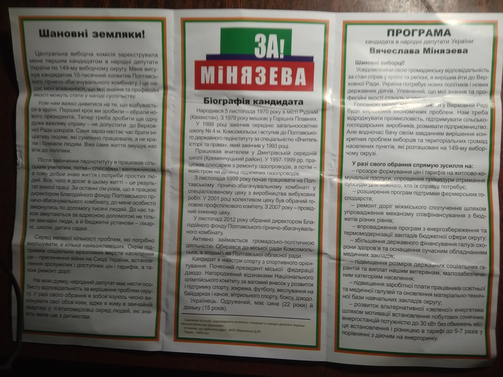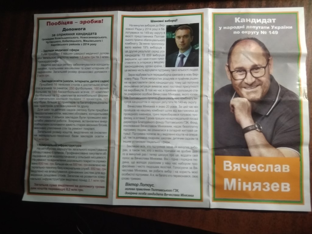 Окрім цього, під час заходу розповсюджувалась агітаційна продукція В’ячеслав Мінязева – буклет з біографічною довідкою та передвиборчою програмою кандидата.