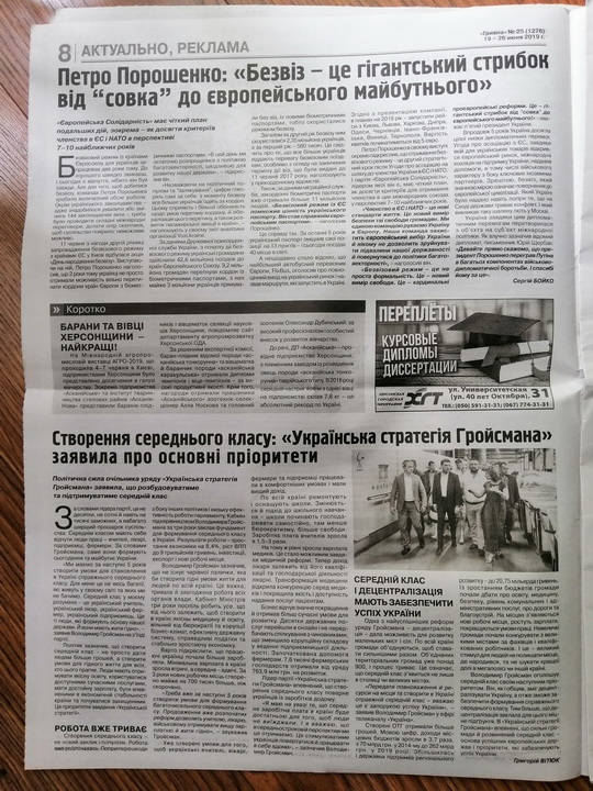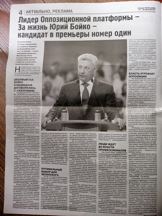 Так само, як і «Батьківщина», «Опозиційна платформа – За життя» намагається своїми об’ємними матеріалами (на повну сторінку) наголосити на високих шансах отримання посади Прем’єр-міністра для свого лідера Юрія Бойка. «Опозиційна партія» сконцентрувалась на презентації свого списку, «Європейська солідарність» на безвізі, а «Українська стратегія» на запитаннях розвитку середнього класу в Україні.