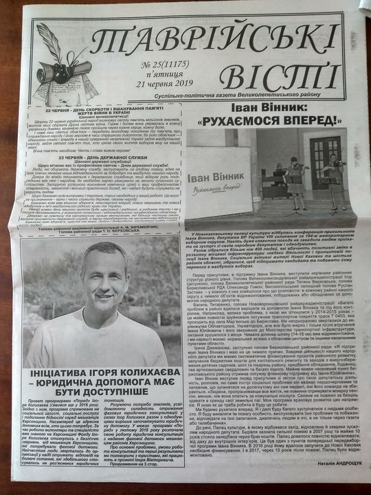 Як зазначає координатор довготермінового спостереження Громадянської мережі ОПОРА в Херсонській області медіа моніторинг матеріалів з ознаками передвиборчої агітації кандидатів у народні депутати свідчить про системне ігнорування норми Закону «Про вибори народних депутатів»  щодо маркування передвиборчої агітації. Ні офіційна реєстрація кандидатом, ні навіть тексти, де прямою мовою вказується, що політик балотується, у більшості випадків не приводять до відповідного маркування. Виключенням стали  газети обласного центру – «Новий день» та «Гривна», які більшу частину матеріалів маркували, та газета Нижньосірогозького району «Червоний промінь», де такі матеріали маркувались позначкою «Реклама».