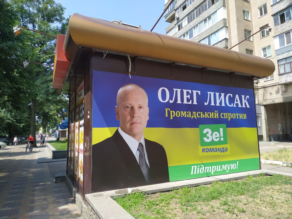 На банері вказано, що Лисак підтримує «Зе!команду», а на рекламі використано відповідний логотип. При цьому 17 червня ЦВК зареєструвала його кандидатом по 194-му округу як самовисуванця. Окрім того, у своїй виборчій програмі він пише, що «не відстоює партійні інтереси».