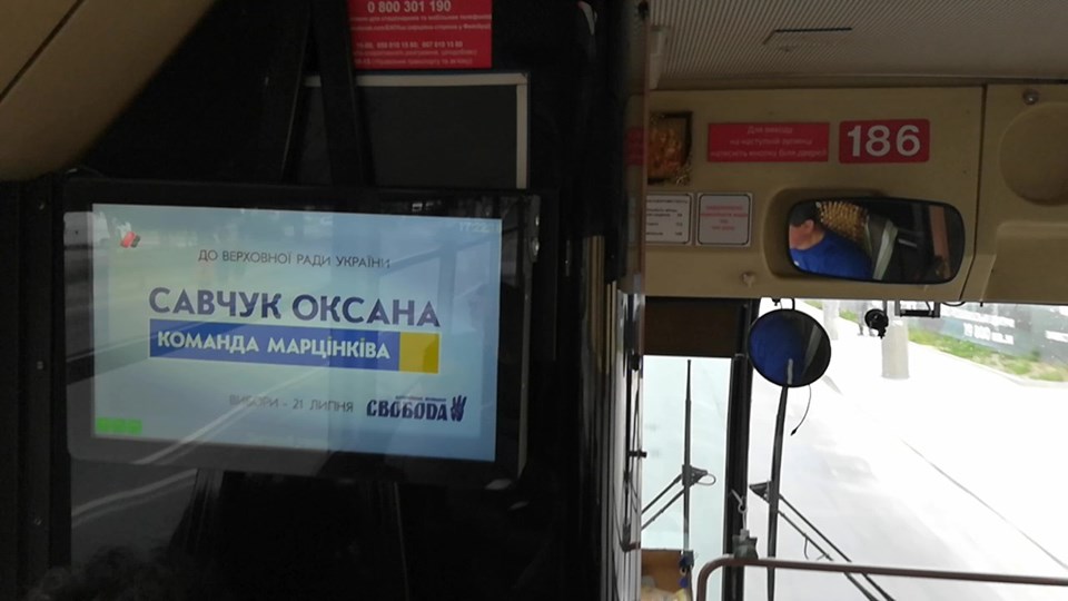 Як повідомляють спостерігачі, у міському тролейбусі з номерним знаком №186 (КП «Електроавтотранс»), який рухається за маршрутом №6 «Автостанція 2 – Європейська площа», пасажирам показували відеоролик з агітацією за Оксану Савчук. На моніторі транслювали картинку із написом «До Верховної Ради України. Савчук Оксана. Команда Марцінківа. Вибори 21 липня» та логотипом ВО «Свобода». (Руслан Марцінків – міський голова Івано-Франківська – Авт.)