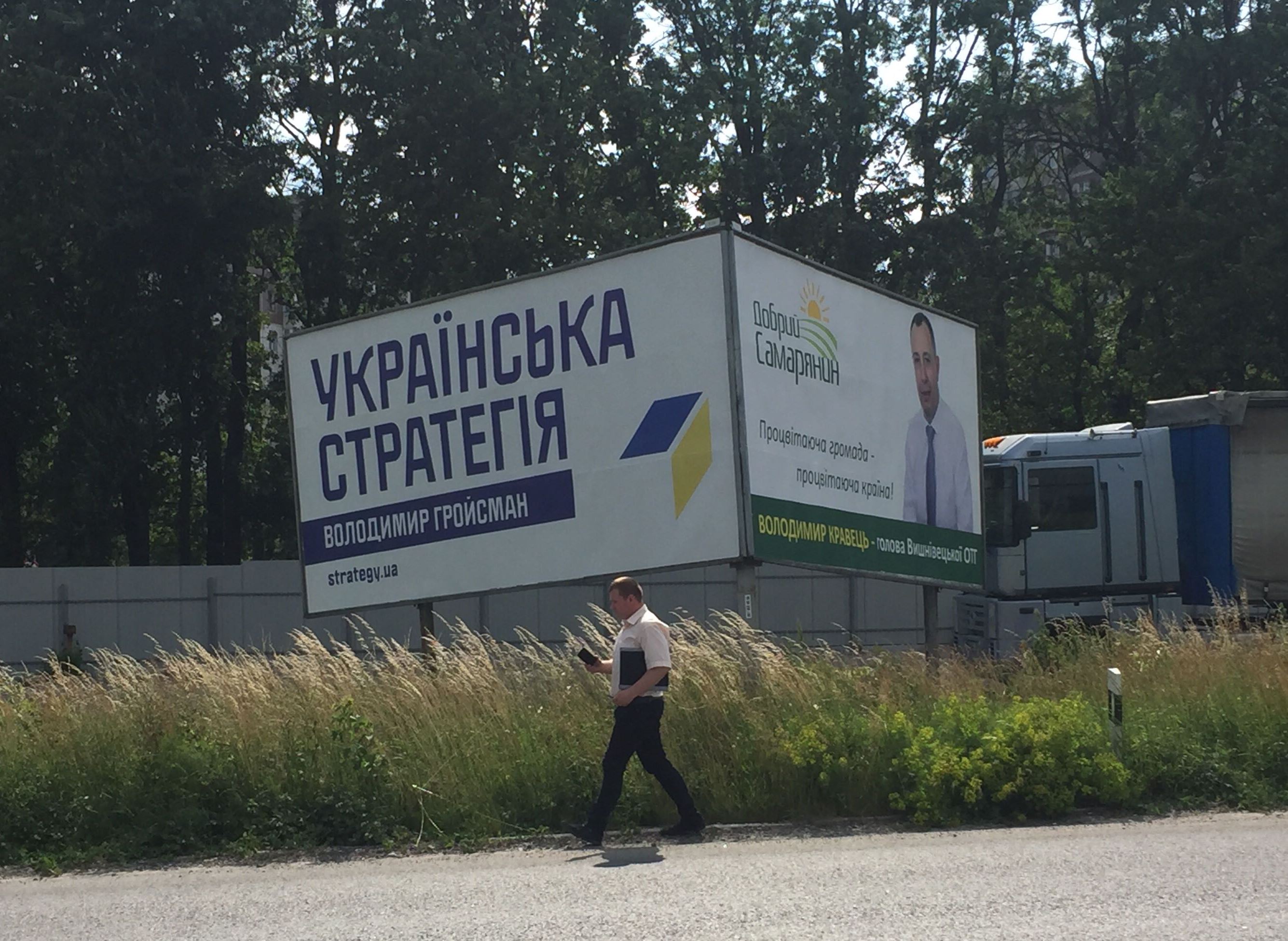 Такий же білборд партії «Українська стратегія Гройсмана» був розташований на вулиці Полковника Морозенка. Поруч з ним був білборд із зображенням, ім’ям та прізвищем кандидата в депутати Володимира Кравця, який зареєстрований 18 червня (постанова ЦВК №1047). Його політична реклама була наступного змісту «Добрий Самарянин. Процвітаюча громада – процвітаюча країна! Володимир Кравець – голова Вишнівецької ОТГ».