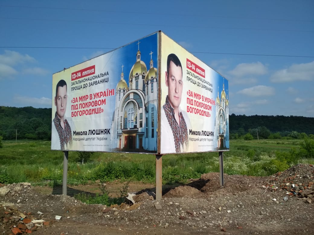 Білборди із зображенням, ім’ям і прізвищем народного депутата і кандидата у депутати Миколи Люшняка містили напис «13-14 липня загальнонаціональна проща до Зарваниці. За мир в Україні під покровом Богородиці». Друкована продукція мала неповні вихідні дані. Були вказані замовник (Люшняк М.В), друк (ТОВ Портнер Медіа) і тираж (20 шт.), поряд з тим не було відомостей про осіб відповідальних за випуск.