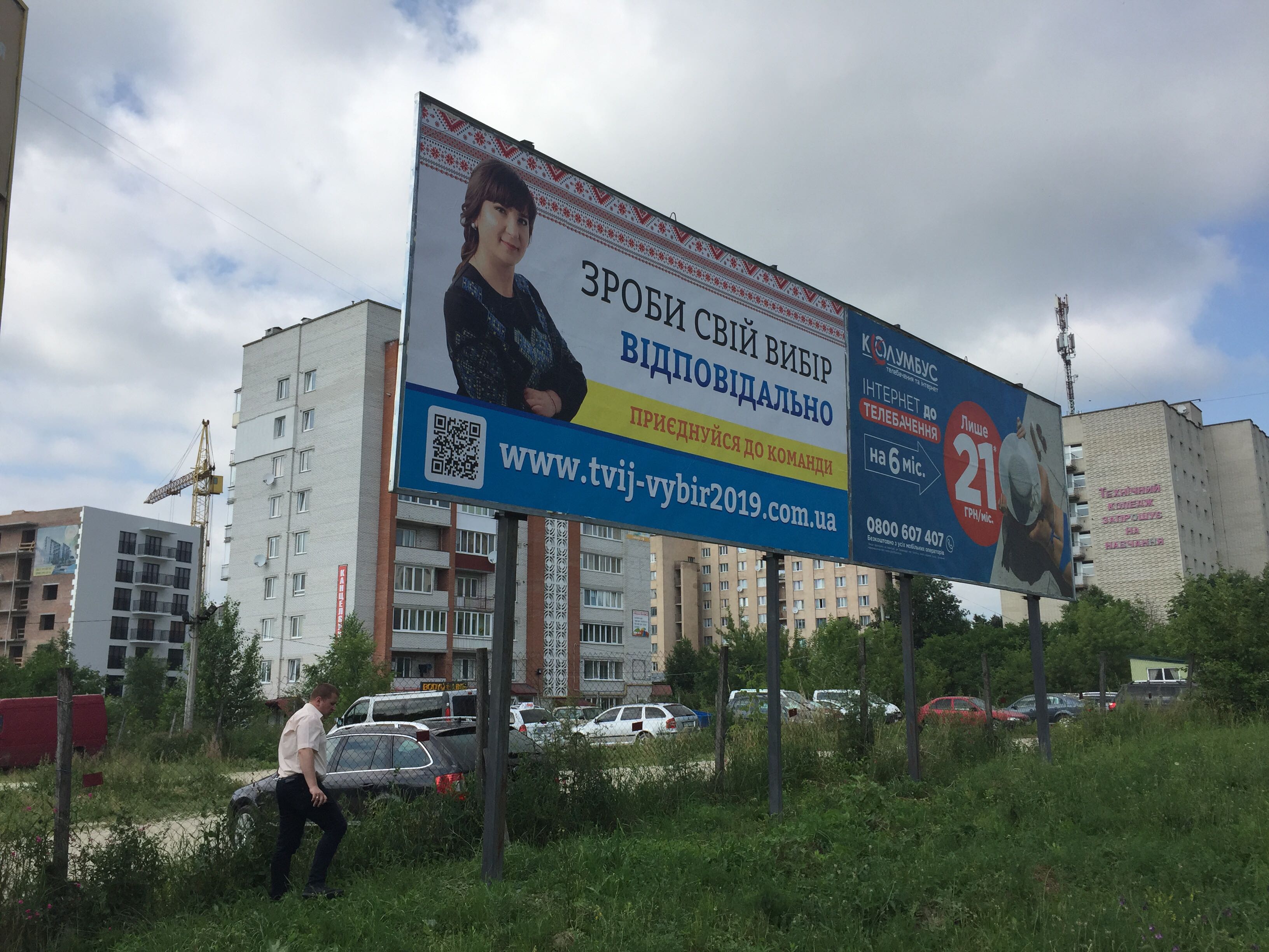 А на вулиці Тарнавського спостерігачі ОПОРИ зафіксували білборд кандидатки в народні депутати від 18 червня Юлії Мамчак (постанова ЦВК №1047). На ньому було рекламне повідомлення «Зроби свій вибір відповідально. Приєднуйся до команди www.tvij-vybir2019.com.ua» із її зображенням.