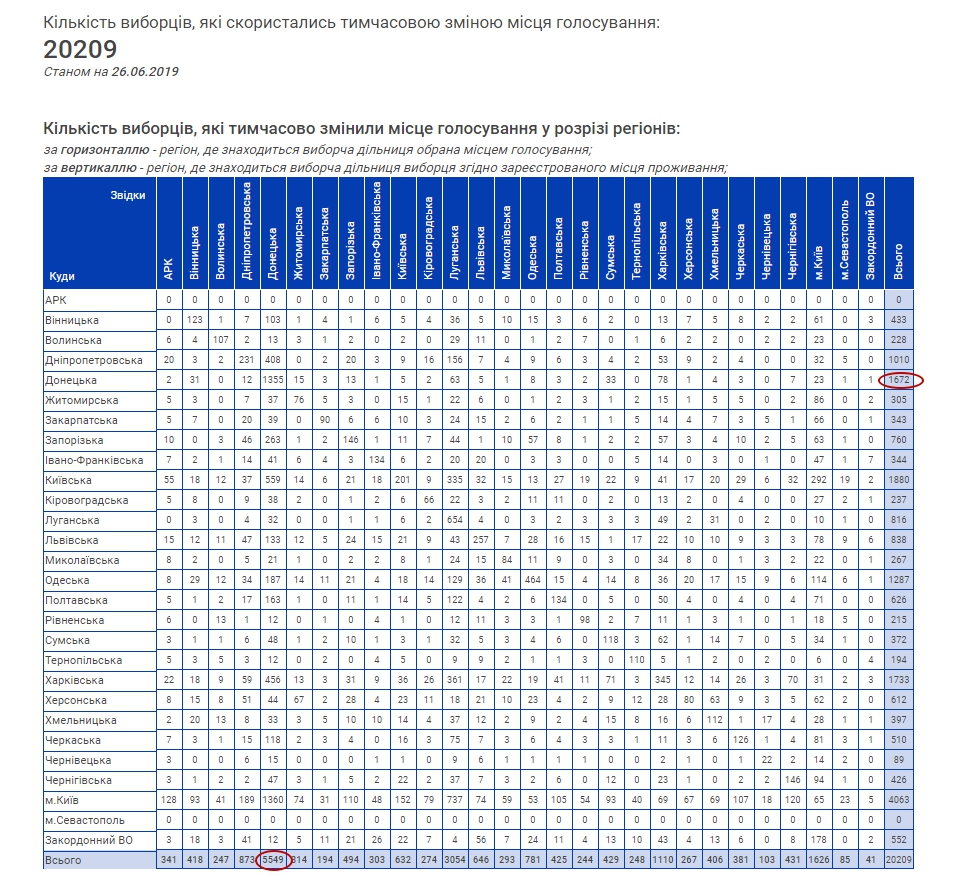 Тимчасове місце голосування у Київській області наразі обрала найбільша кількість мешканців Донеччини - 559. Найменше жителів Донецької області голосуватиме у Тернопільській та Рівненській областях – наразі по 12 виборців у кожній з областей.