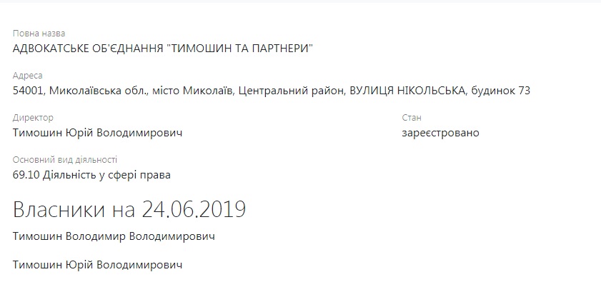 Окрім того, відповідно до пункту 2 частини 2 статті 61 Закону України «Про вибори народних депутатів України», кандидату Володимиру Тимошину може бути оголошено попередження від ЦВК, якщо даний факт буде встановлено судом. Адже, відповідно до відомостей opendatabot.ua, станом на 24 червня 2019 року Володимир Тимошин є засновником адвокатського об’єднання «Тимошин та партнери».