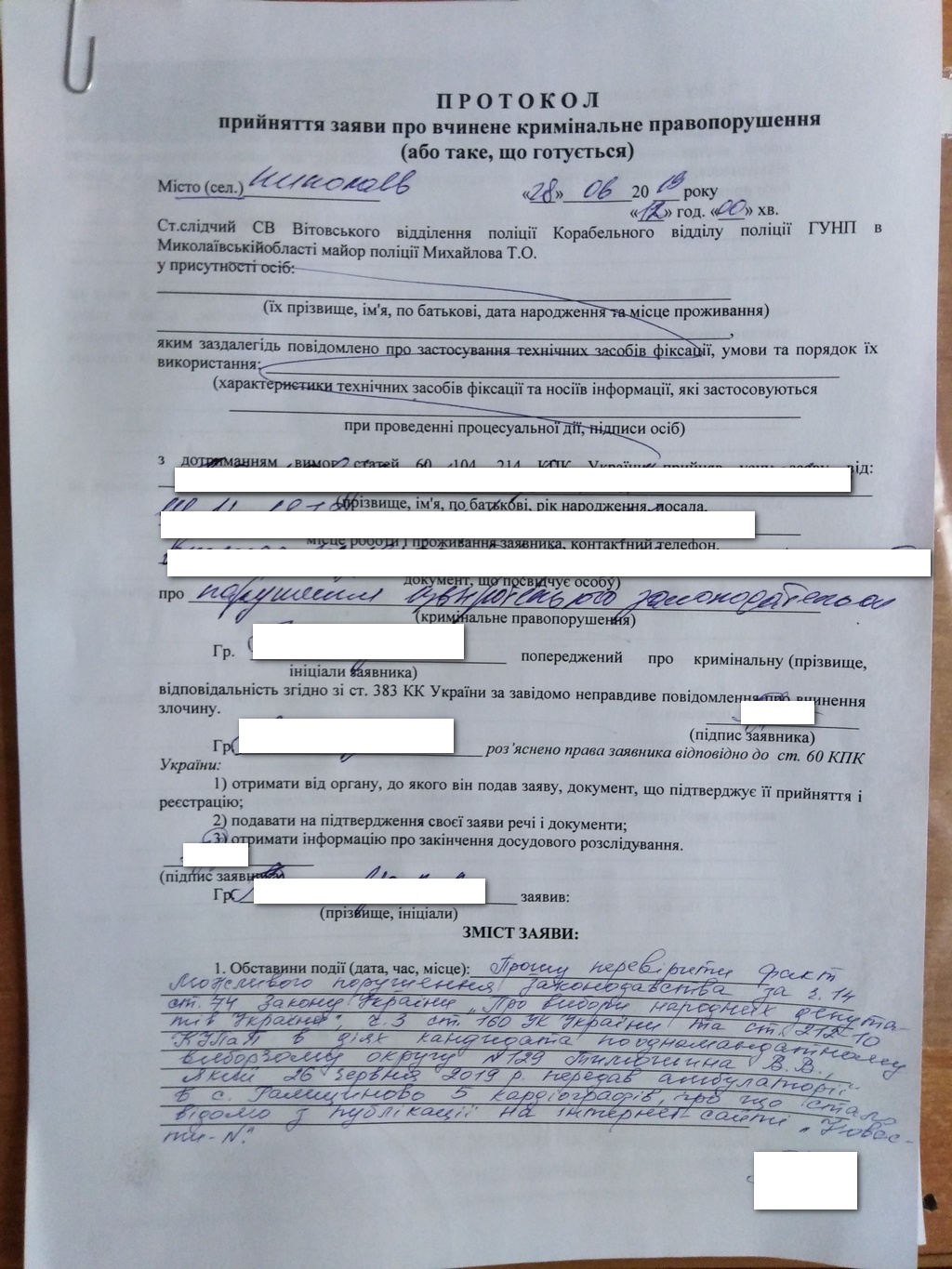 28 червня спостерігачі ОПОРИ звернулись до Вітовського відділення поліції для перевірки фактів порушення обмежень щодо ведення передвиборчої агітації. Надання кандидатом відповідних кардіографів, може мати склад порушення 212-10 КУпАП або частини 3 статті 160 Кримінального Кодексу.