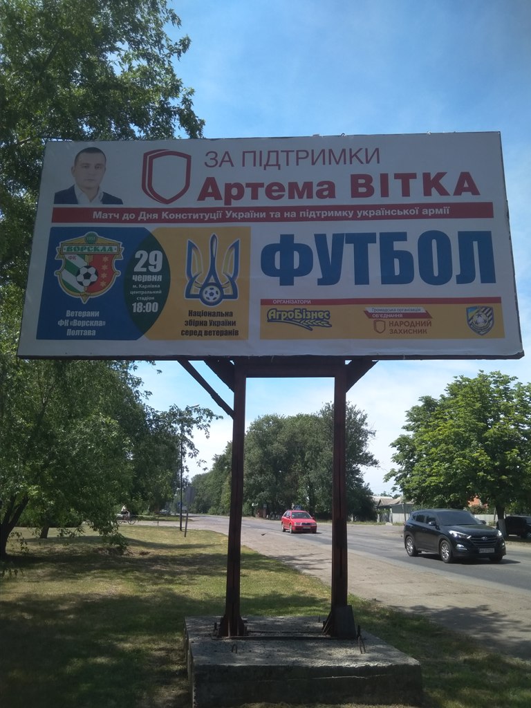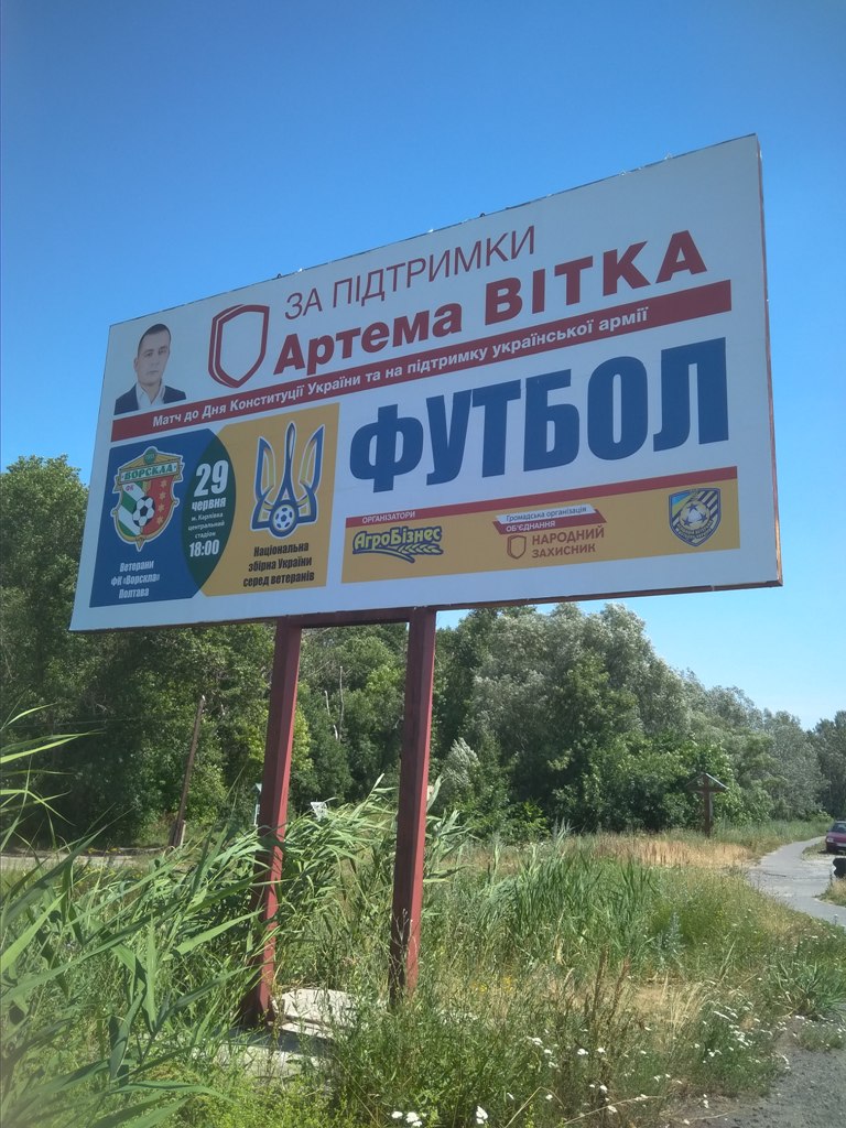 Також 27 червня в 149 ВО були зафіксовані чотири білборди, котрі не містили вихідних даних. Так, в місті Карлівка по вулиці Полтавський шлях розміщено два білборди з запрошенням на футбольний матч за участі ветеранів «Ворскли» та «Збірної України серед ветеранів» та написом: «За підтримки Артема Вітка».
