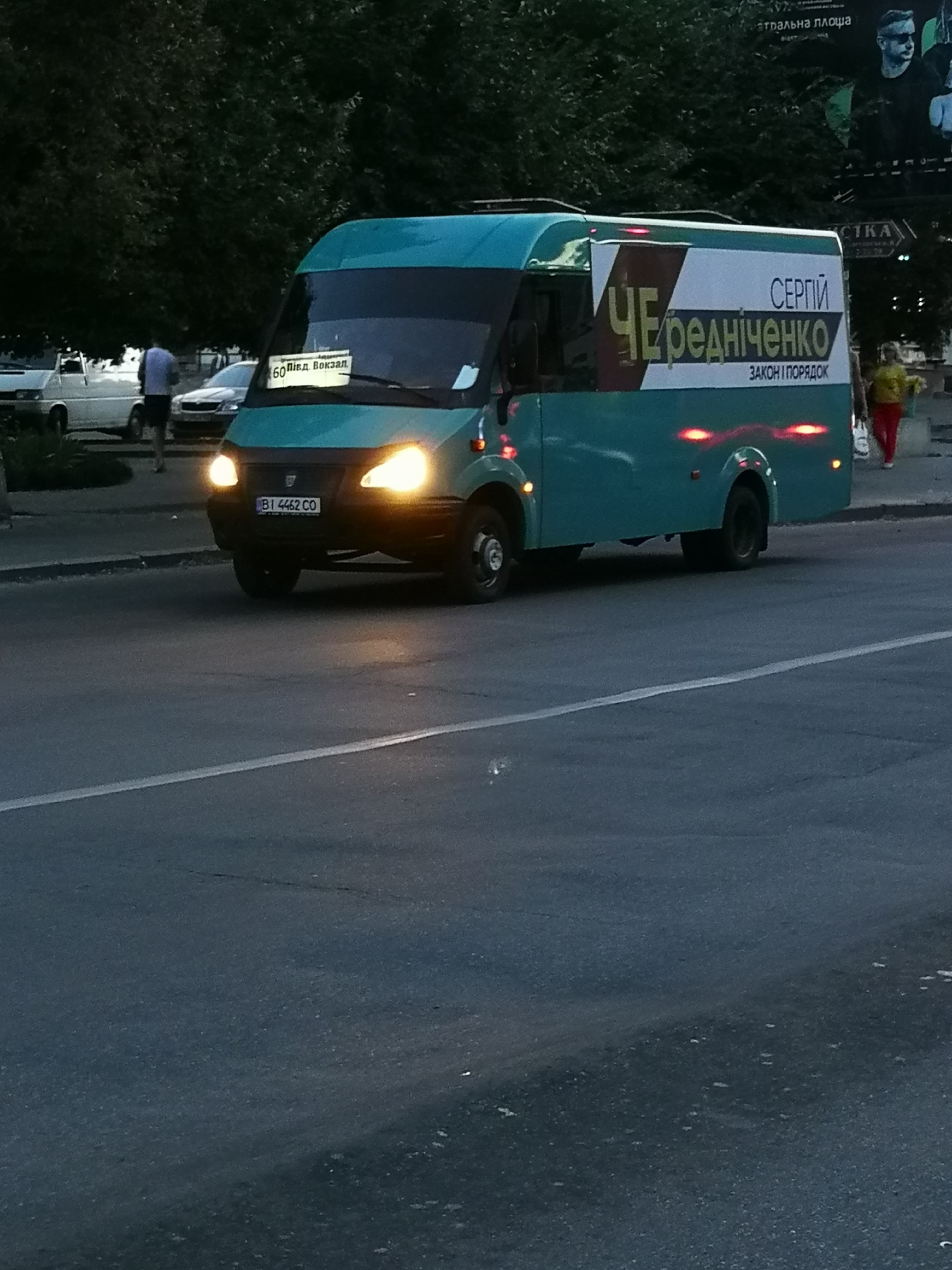 Маршрутне таксі з агітацією на користь Сергія Чередніченка курсує в Полтаві за маршрутом №60. На автотранспорті збоку розміщена агітаційна продукція кандидата з написом: «Сергій Чередніченко. Закон і порядок».