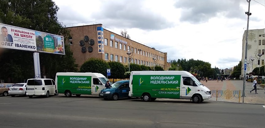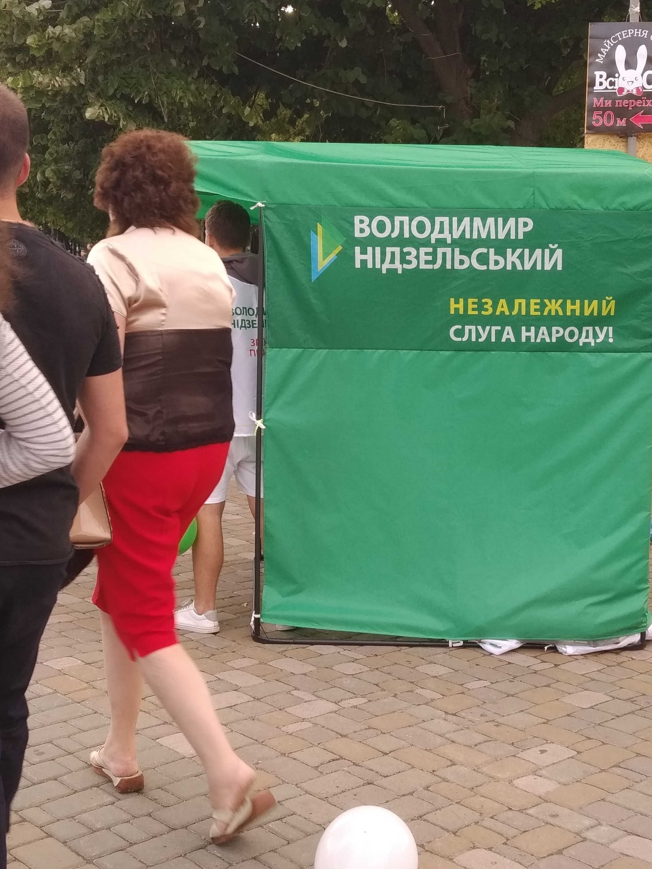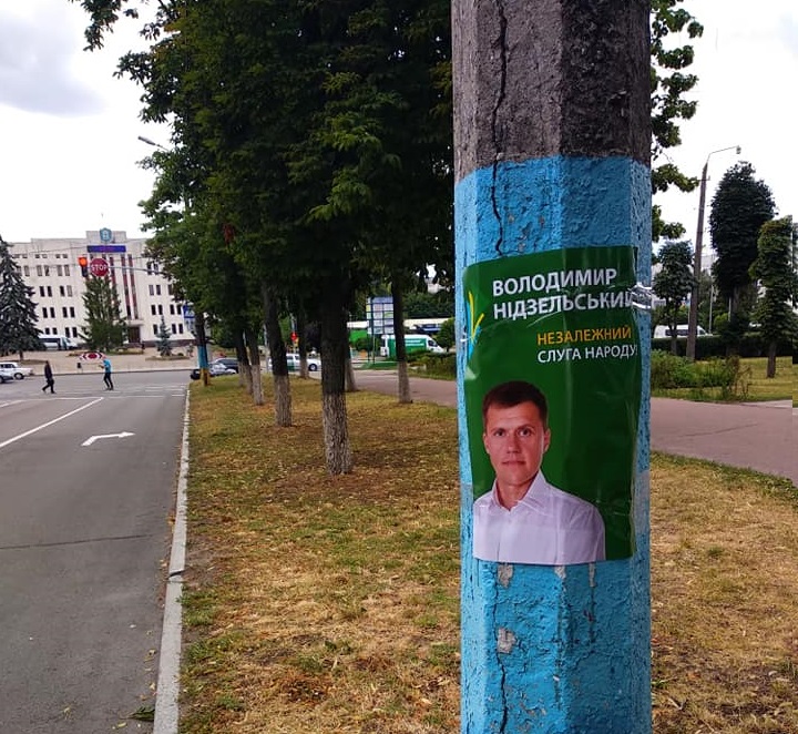 Зазначимо, хоча Володимир  Нідзельський зареєстрований у 97 виборчому окрузі як кандидат-самовисуванець, у своїй агітаційній діяльності він використовує символіку, гасла та кольори у  стилістиці політичної партії  «Слуга народу». Зокрема, на кульках, автобусах, наметах та агітаційних листівках містився напис «Володимир  Нідзельський незалежний слуга народу!».