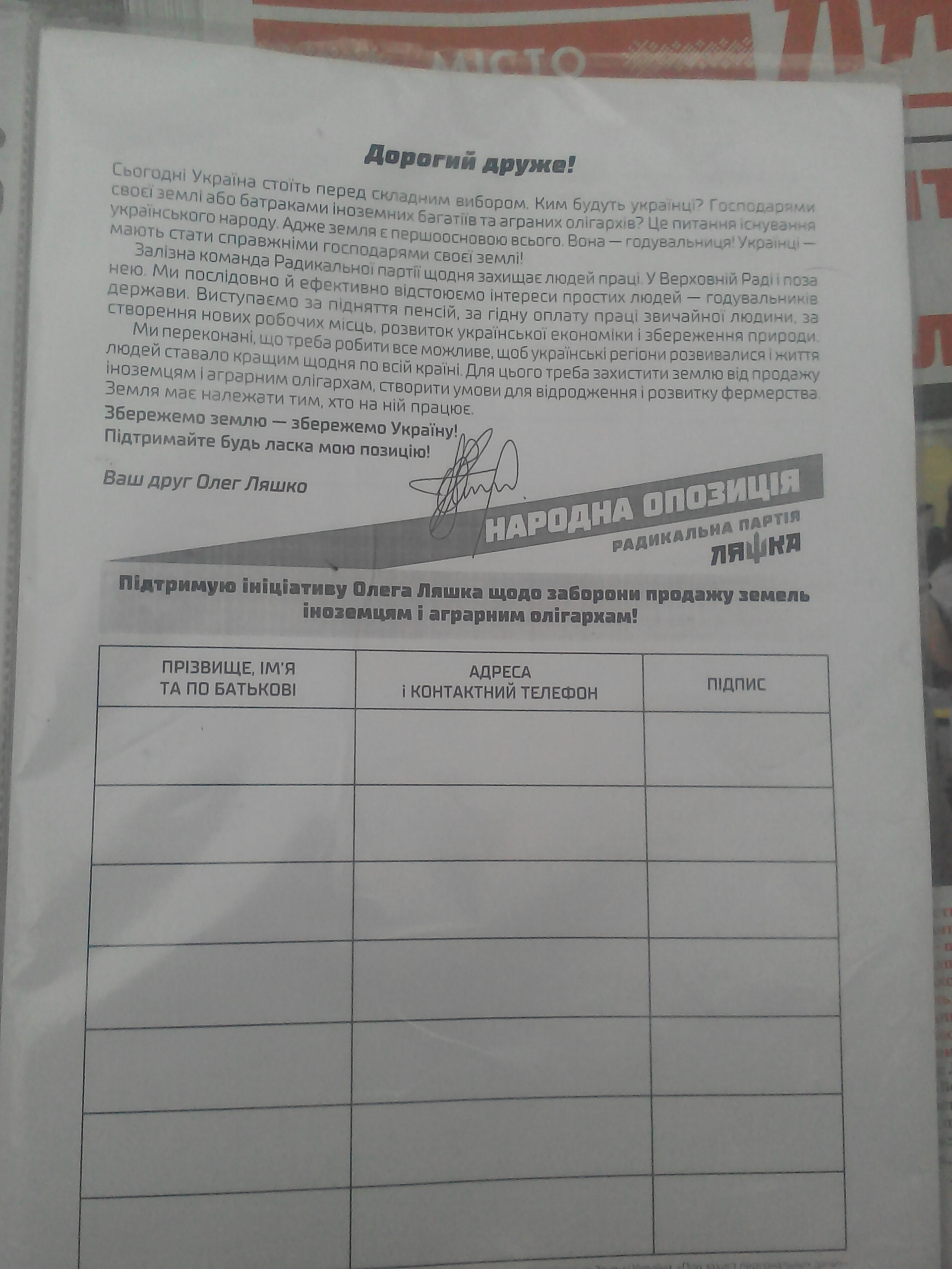 Окрім того, в наметі збирали підписи «на підтримку ініціативи Олега Ляшка щодо заборони продажу земель іноземцям і аграрним олігархам». У відповідній анкеті необхідно було вказати свої прізвище, ім’я, по батькові, адресу, контактний телефон і поставити підпис. Внизу форми дрібним шрифтом зазначено: «Своїм підписом підтверджую надання згоди на обробку моїх персональних даних відповідно до Закону України «Про захист персональних даних». До слова, нещодавно в Шепетівці ОПОРА фіксувала збір персональних даних громадян у наметах партії «Українська стратегія Гройсмана».