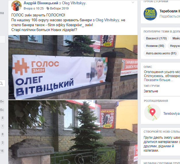 Повідомлення про хуліганські дії з’явилося на сторінці «Теребовля – твоє місто» в соціальній мережі Facebook 30 червня. У дописі йшлося, що по 166 округу масово зривають банери Олега Вітвіцького (партія «Голос»).