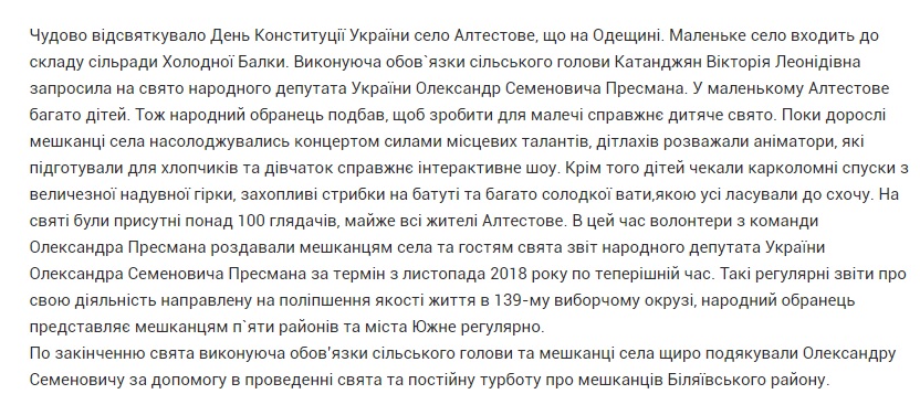 Так, до Дня Конституції кандидат у нардепи по округу №139 (центр – м. Роздільна) Олександр Пресман організував дитяче свято у селі Алтестове з безкоштовними батутами, солодкою ватою і змаганнями.