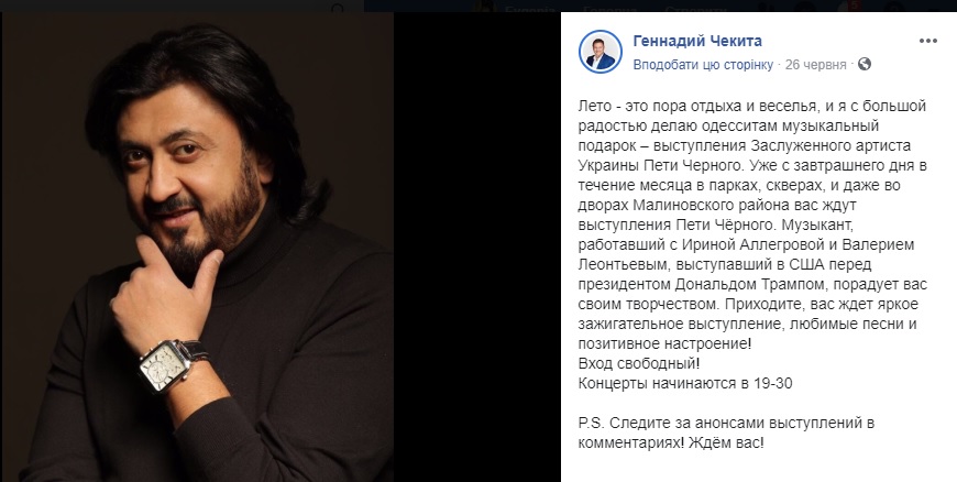 Ще один кандидат – Геннадій Чекіта, який балотується по округу №134 (Київський район Одеси), взяв участь у концерті артиста Петра Чорного. При цьому на сторінці кандидата є обіцянка, що такі заходи стануть регулярними впродовж липня: