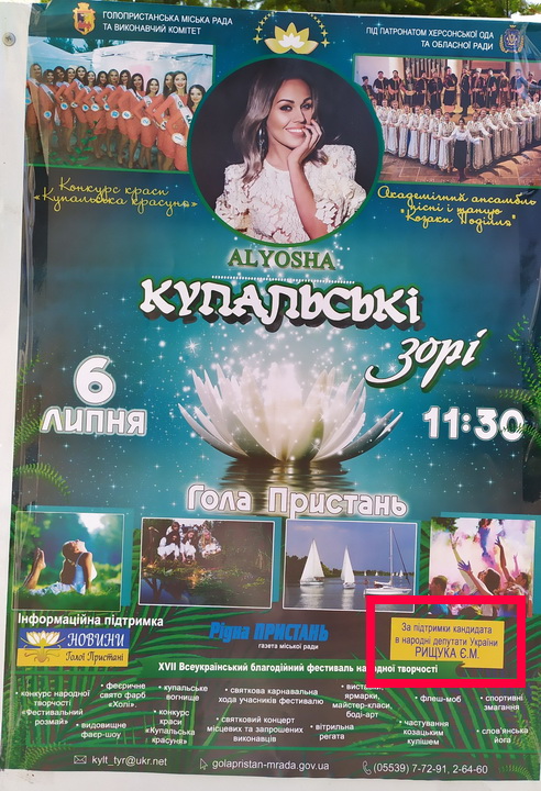 Кандидати в народні депутати по херсонських округах виступають спонсорами концертів, фестивалів та свят, використовуючи благодійні фонди та власні кошти. Деякі обмежуються тільки згадками свого імені на афішах, інші – розміщують під час заходів банери перед сценою та намети.