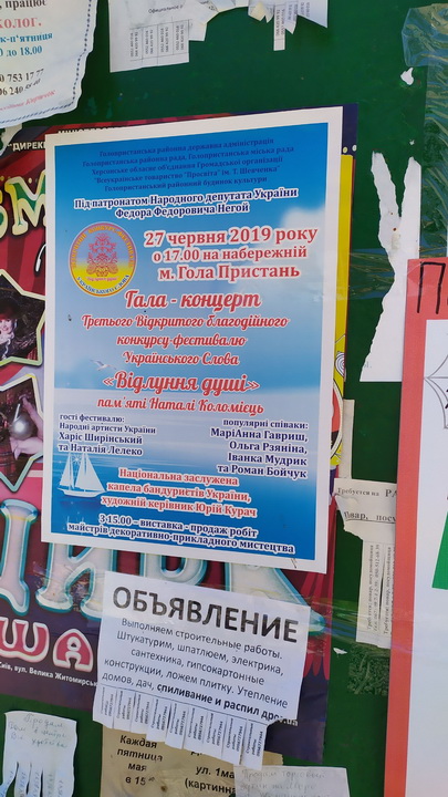 27 червня в місті Гола Пристань відбувся гала-концерт третього відкритого благодійного конкурсу фестивалю українського слова «Відлуння душі» «під патронатом» чинного народного депутата та кандидата по 186-му округу Федора Негоя (самовисування).