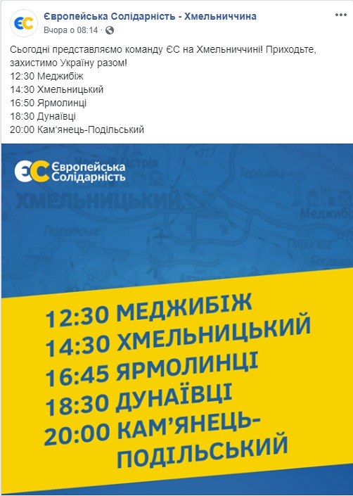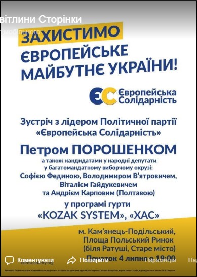 4 липня Хмельниччину відвідав лідер партії «Європейська Солідарність» Петро Порошенко разом із командою. Партійці побували в селищах Меджибожі, Ярмолинцях, містах Хмельницькому, Дунаївцях та Кам’янці-Подільському. Оголошення про візит опублікували вранці 4 липня на сторінці «Європейська Солідарність - Хмельниччина» у Facebook.