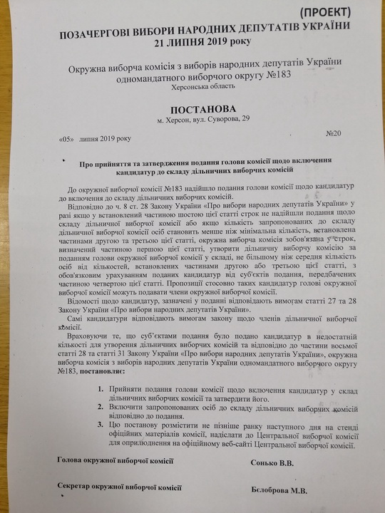 Проте на момент завершення засідання постанова «Про прийняття та затвердження подання голови комісії щодо включення кандидатур до складу дільничних виборчих комісій» ще не була підписана, хоча на ній вже стояло прізвище нового голови. Члени комісії залишились працювати.
