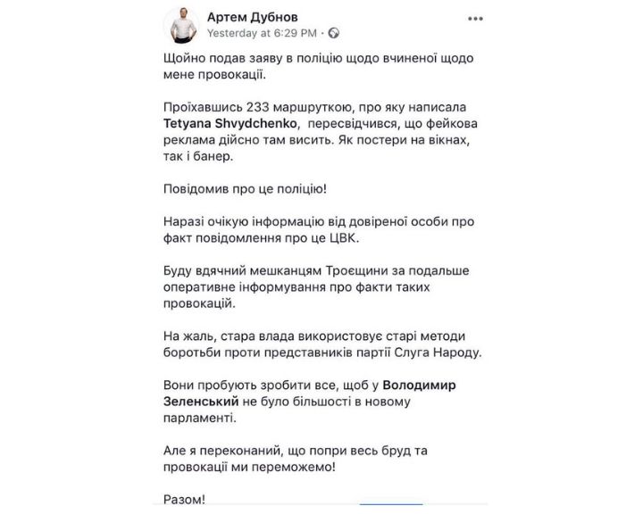 Ще один кандидат від “Слуги народу”, Артем Дубнов, що балотується на Троєщині, заявляв про те, що нібито його конкуренти розмістили агітацію за нього у громадському транспорті на маршруті №233.
