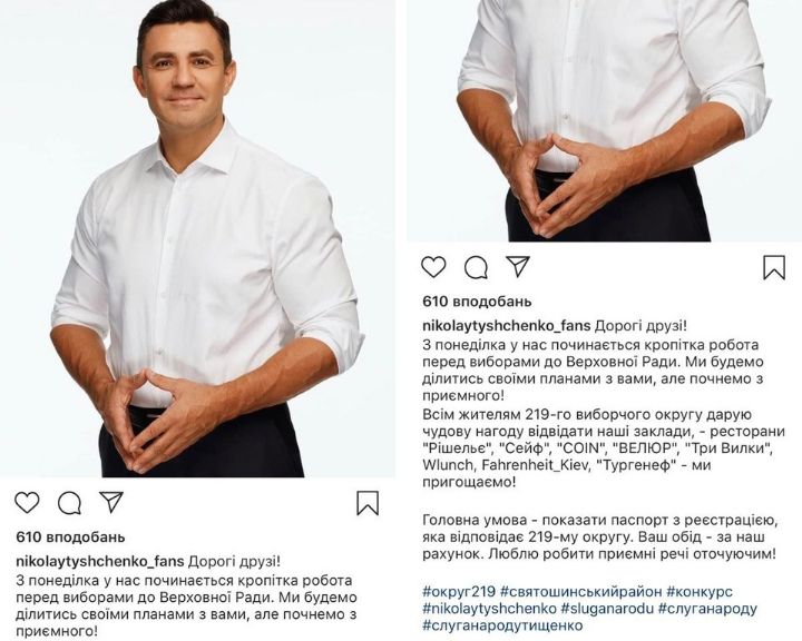 Раніше, в останні дні червня, в соціальній мережі Instagram поширювалася реклама із портретом кандидата Миколи Тищенка, що висувається як мажоритарник від партії “Слуга народу” у 219 окрузі (Святошинськи район). Допис поширювала група з назвою nikolaytyshchenko_fans. У ньому йшлося про те, що кандидат запрошує на безкоштовне пригощання у своїх ресторанах людей з 219 округу.