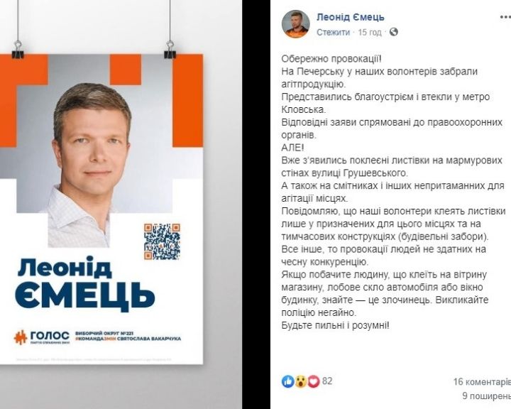 3 липня кандидат-мажоритарник від партії “Голос” Леонід Ємець повідомив, що у його активістів невідомі вкрали пачку плакатів і тепер ця поліграфія може з'явитись у невідведених для цього місцях.