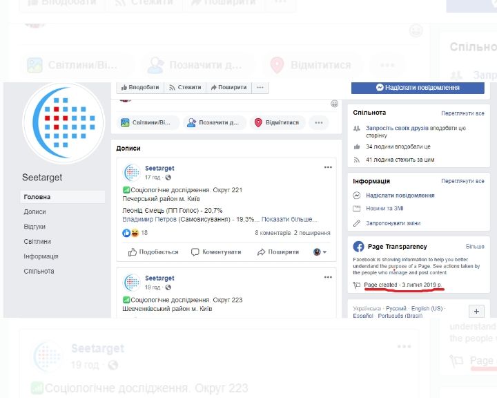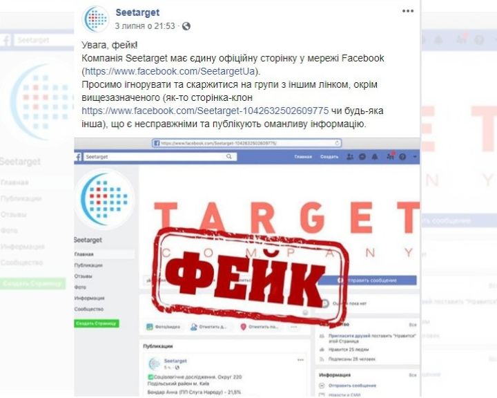 Сторінка-копія була створена 3 липня і нібито соціологічні дослідження — єдиний контент на ній. Станом на 4 липня за Facebook-акаунтом компанії Seetarget стежить близько 700 читачів, за іншою з такою ж назвою і логотипом — близько 40.