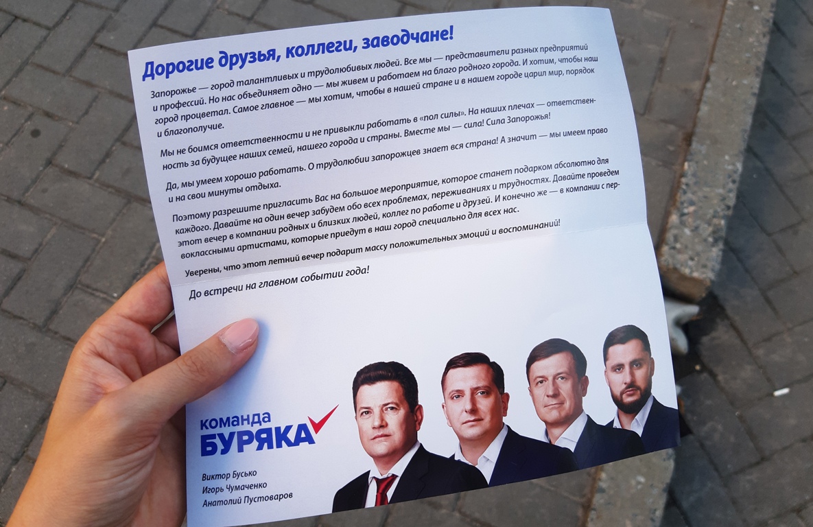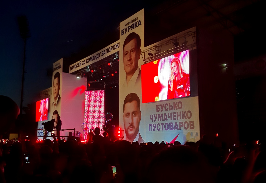6 числа на стадіоні «Славутич-Арена» відбувся концерт за участі запрошених іноземних виконавців C.C. Catch та La Bouche, на який можна було потрапити за запрошеннями, де було опубліковане звернення до запоріжців від «команди Буряка» із розміщенням їхніх імен та портретних світлин. Ці особи зареєстровані кандидати у народні депутати України: Віктор Бусько, Ігор Чумаченко, Анатолій Пустоваров. Також поруч з ними була світлина Володимира Буряка.
