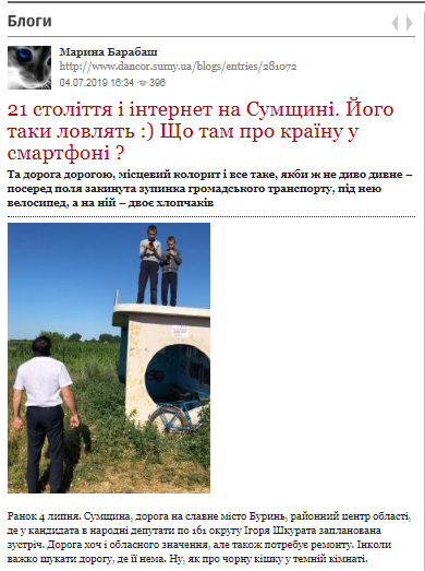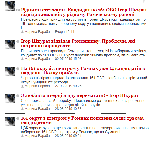 На користь кандидата у народні депутати у 161 одномандатному виборчому окрузі (м. Ромни) Ігоря Шкурата (суб’єкт висування – самовисування) на шпальтах онлайн-видання опубліковані матеріали з ознаками замовності. Зокрема, на сайті газети «Данкор», у розділі «Блоги» є 14 (станом на 06 липня 2019 року) публікацій від імені Марини Барабаш. Перша з них з’явилась 19 червня 2019 року, найсвіжіша датована 4 липня 2019 року. У цих публікаціях описуються хід виборчого процесу у 161 виборчому окрузі та зустрічі з виборцями і політичні заяви кандидата Ігоря Шкурата. Публікації не містять позначки «політична реклама».