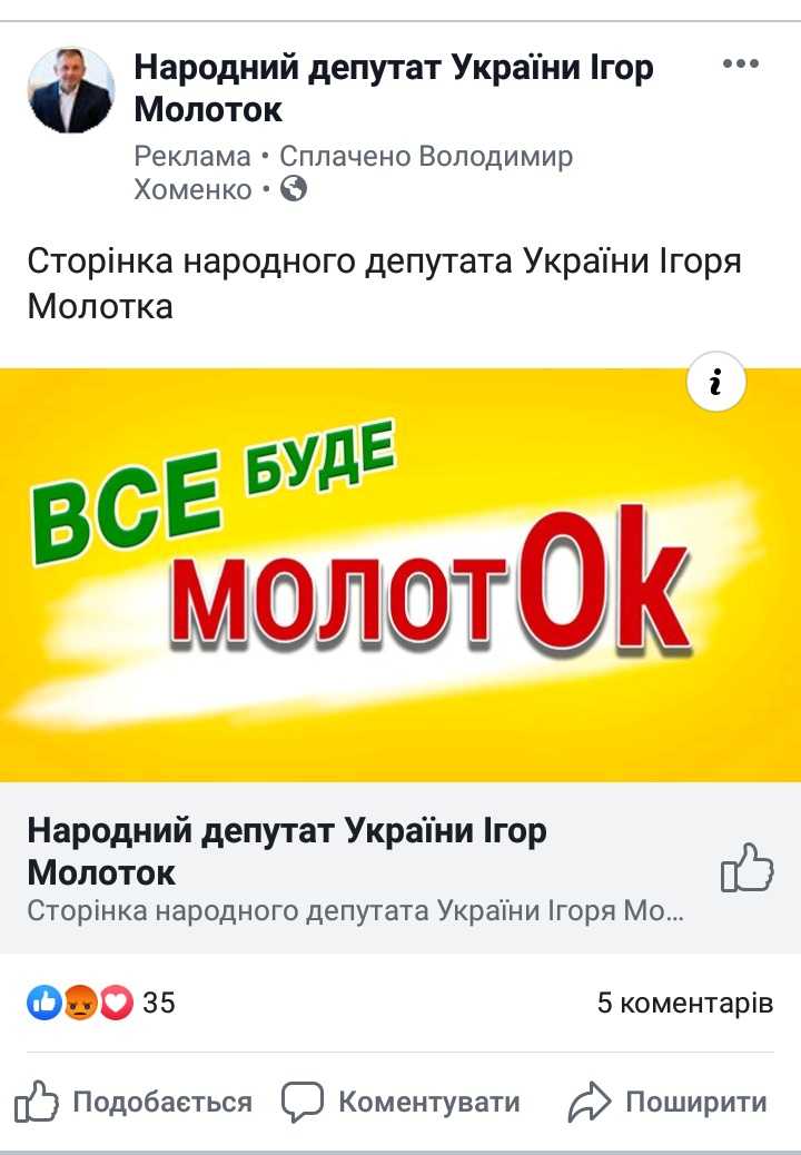 За підтримки кандидата також було влаштовано святкову дискотеку у Шостці (центр 160 виборчого округу). Анонс заходу, який поширювали у соціальних мережах, містив девіз «Все буде МолотОк». Так само на заході було облаштовано фотозону, де можна було зробити світлини із табличкою «#всебуде_МолотОК» та зображеннями кандидата.