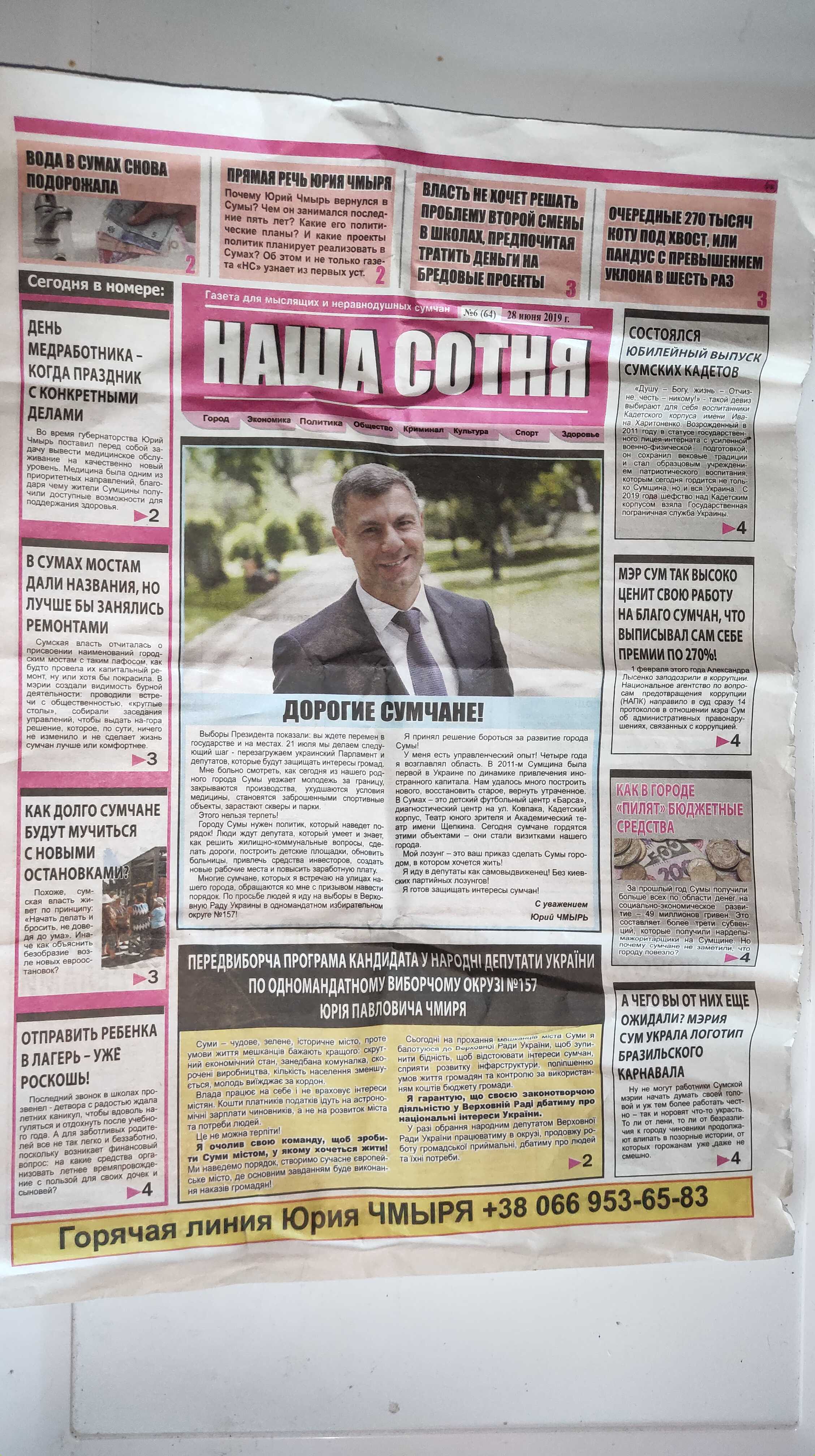Також, як повідомлялось раніше, що представники громадської організації «Sumy це круто» назвали його «ідейним натхненником» родинного спортивного свята, де розігрувались цінні призи. Наразі намети ГО «Sumy це круто» обладнали також позначкою «Громадська приймальня Юрія Чмиря». У цих же наметах поширюють газету «Наша Сотня», де є матеріали з ознаками замовності. Зокрема, у виданні викладена програма і «пряма мова» кандидата у народні депутати  Юрія Чмиря. Решта матеріалів присвячені критиці місцевої влади та опису здобутків кандидата на посту голови обласної державної адміністрації.