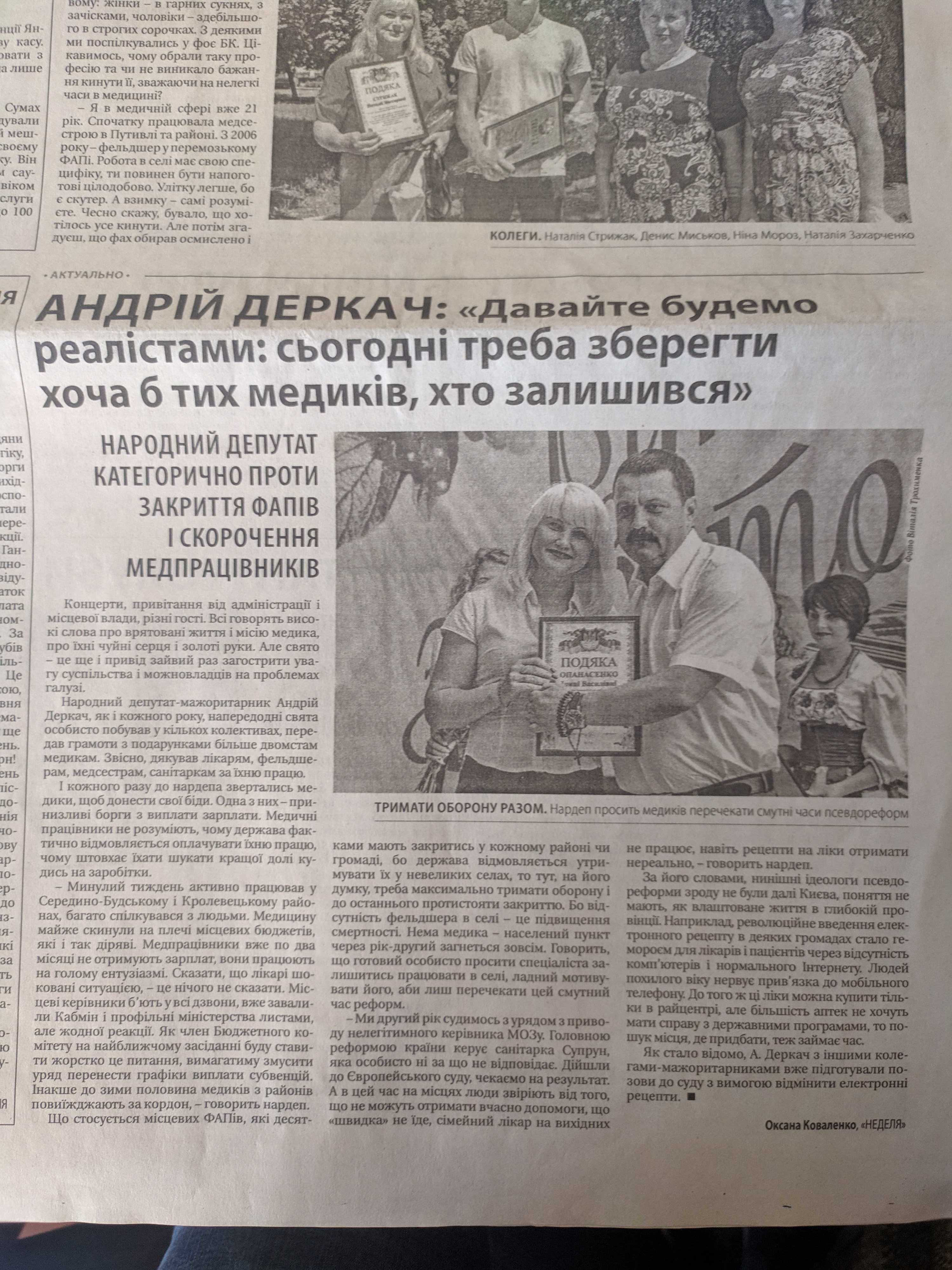 Діяльності цього кандидата також присвячені деякі публікації у місцевій пресі (газета «Неделя»). Зокрема, висвітлюється участь Андрія Деркача у відкритті дитячого православного табору або привітання ним медиків із професійним святом. Раніше повідомлялось про привітання з Днем Конституції від імені Андрія Деркача, розміщені на сайті цієї ж газети. Публікації не містять позначки «Політична реклама», а Андрій Деркач фігурує в них, як народний депутат.