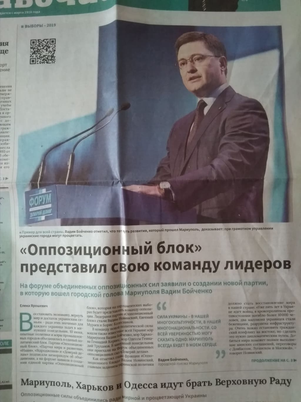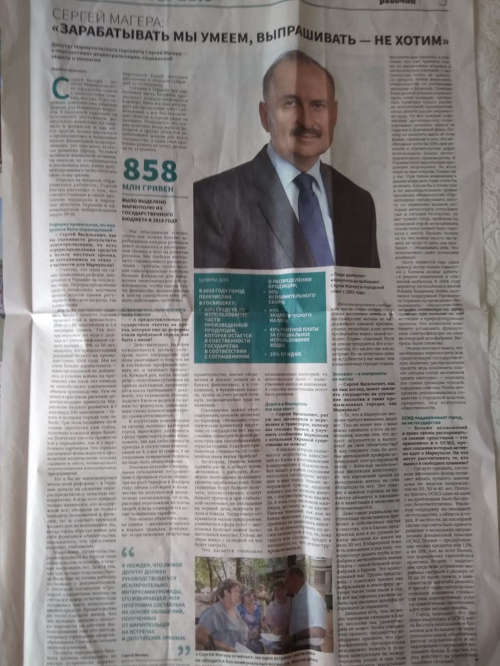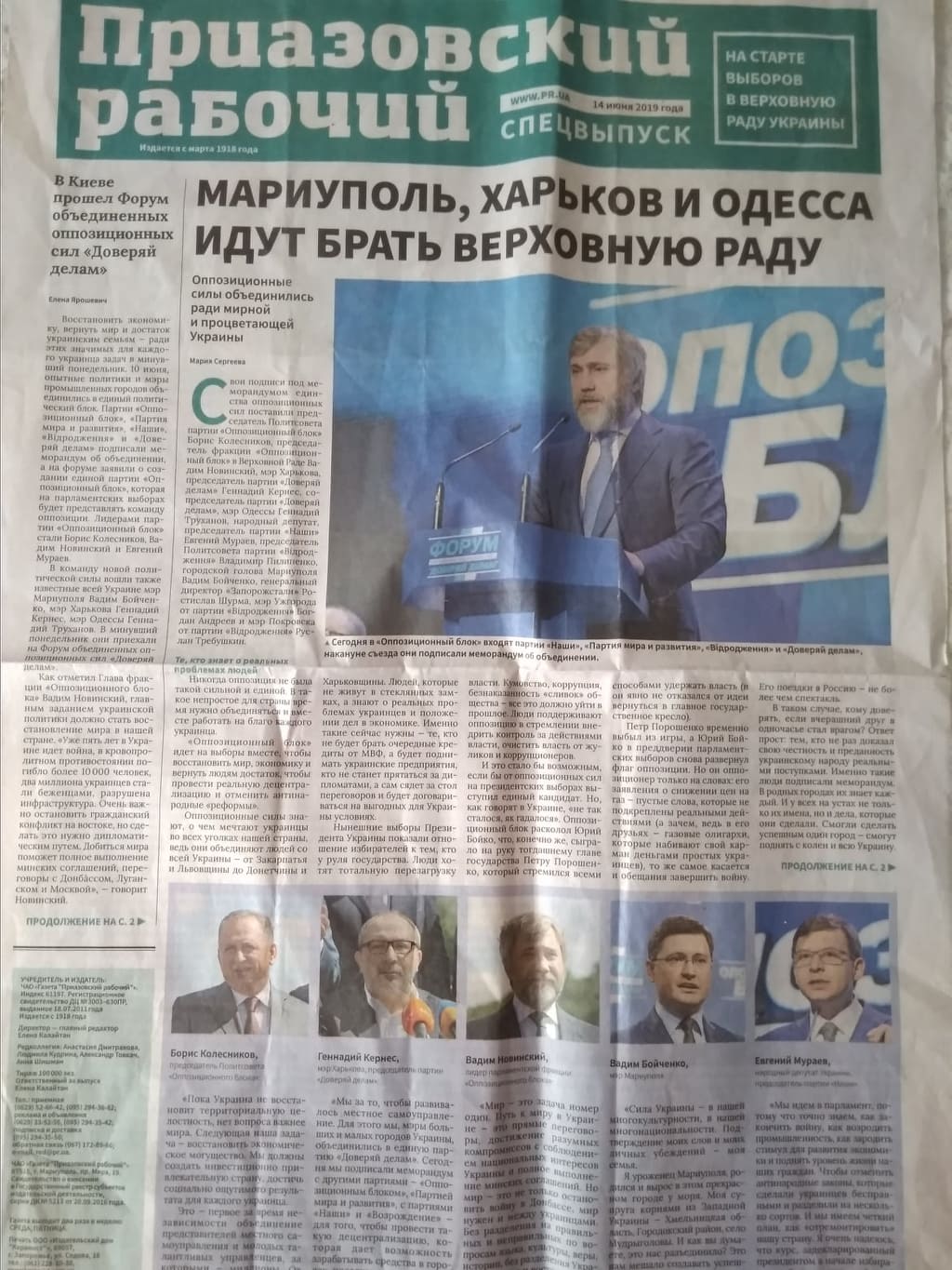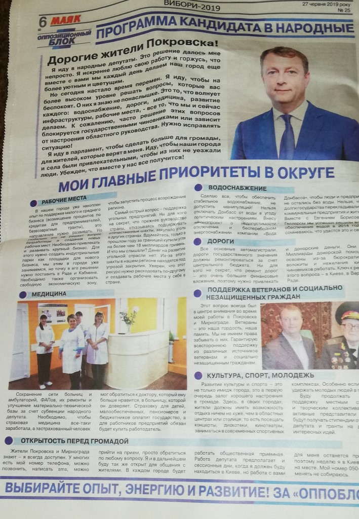 Сергій Магера, висунутий партією «Опозиційний блок» для участі у парламентських виборах, з’явився на сторінках спецвипуску маріупольського видання у рубриці інтерв’ю із заголовком: «Зарабатывать мы умеем, упрашивать не хотим». На перших двох сторінках примірника розміщено звітний матеріал про з’їзд партії, передвиборчі амбіції й презентація списку лідерів.