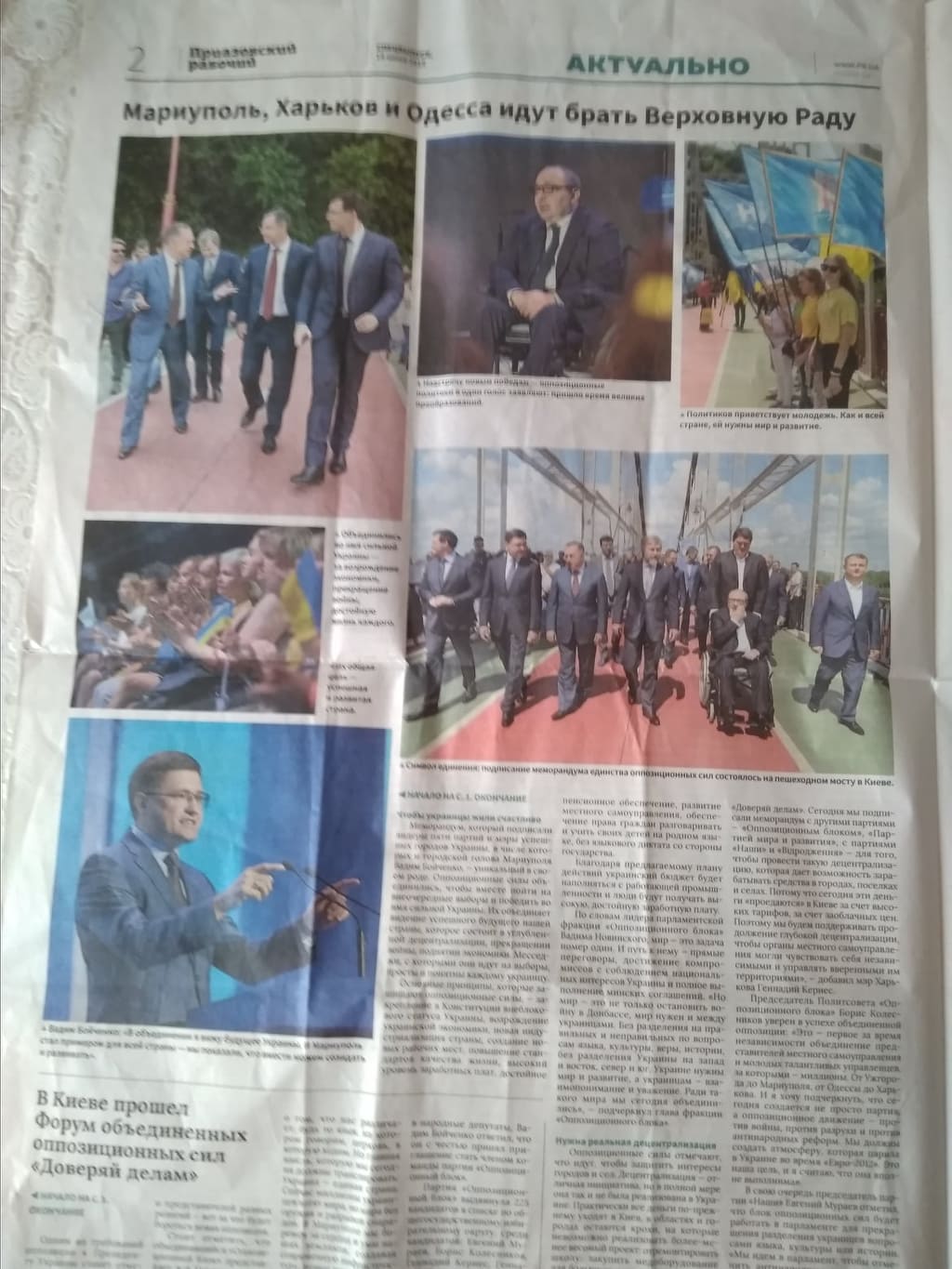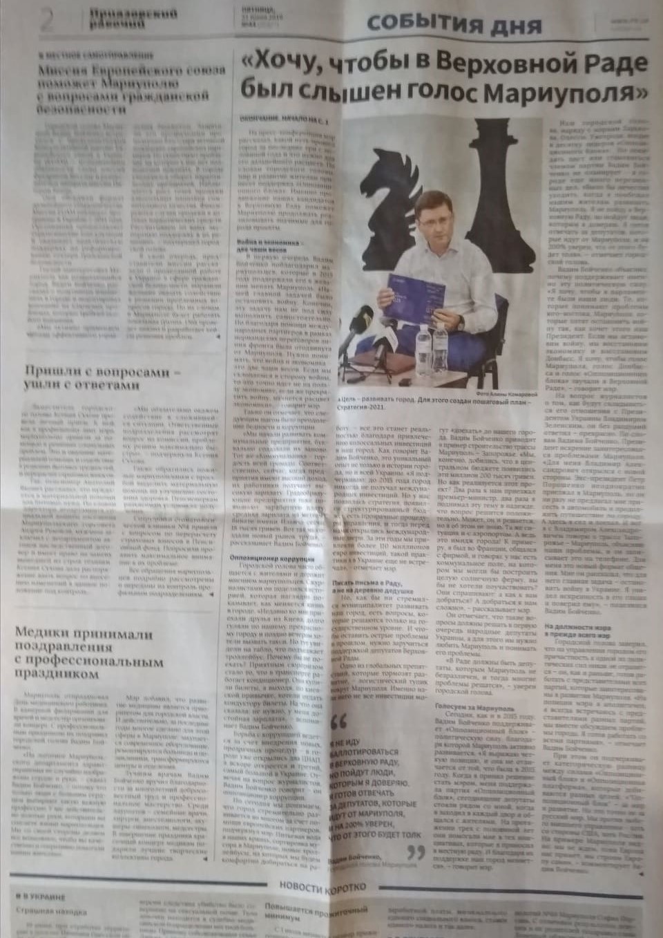 У попередньому випуску опублікований майже аналогічний матеріал на користь партії «Опозиційний блок», також без маркування. Наступною йде стаття про стратегію розвитку від Вадима Бойченка, очільника Маріуполя, і слова підтримки «Опозиційному блоку», у партійних списках якої зазначений сам Бойченко. Матеріал розміщений на 2-й сторінці у рубриці «События», жодним чином не відокремлений.