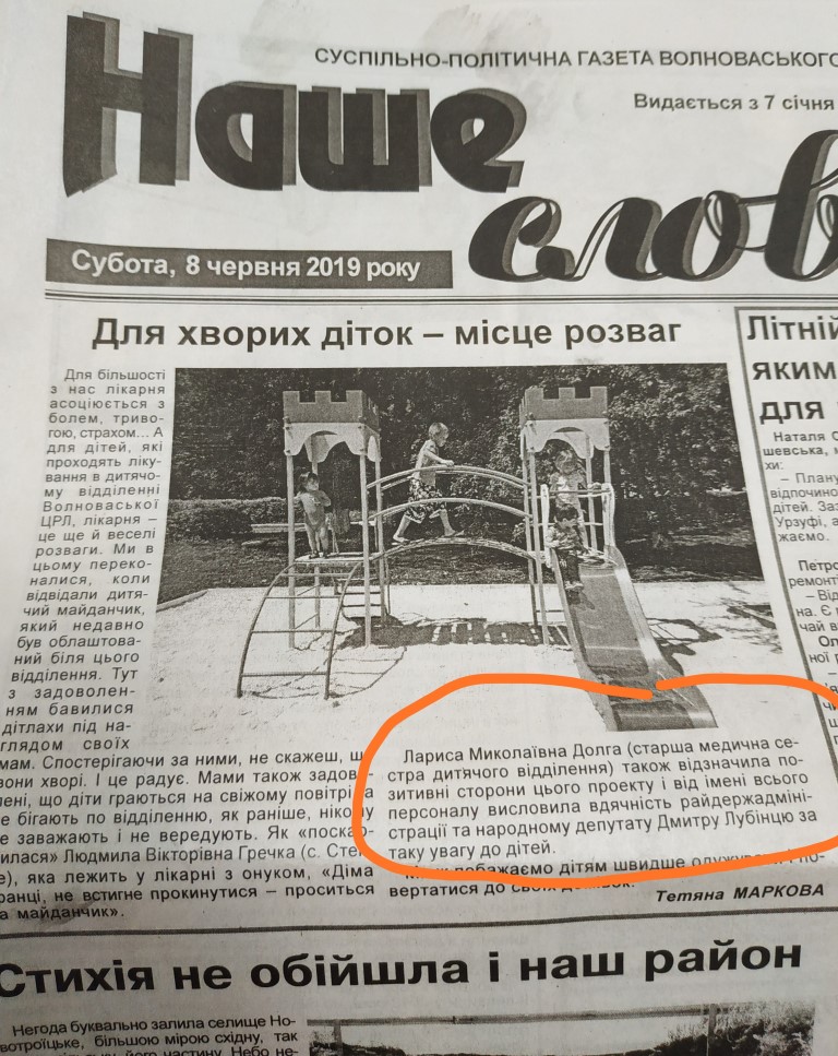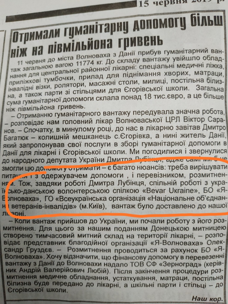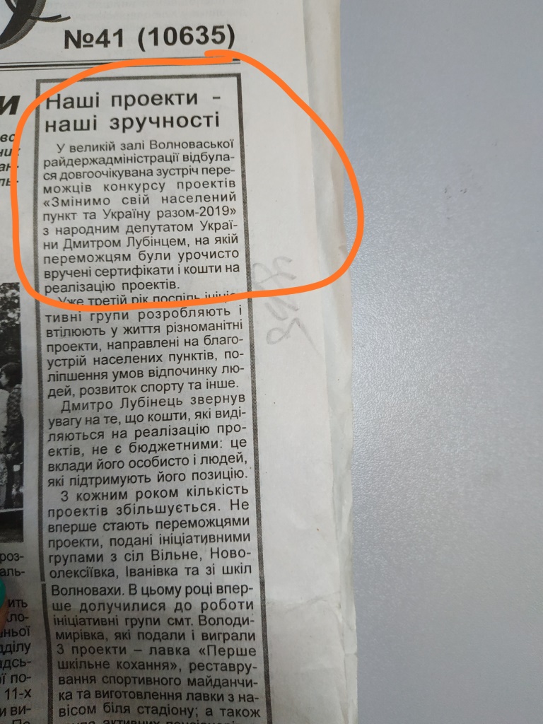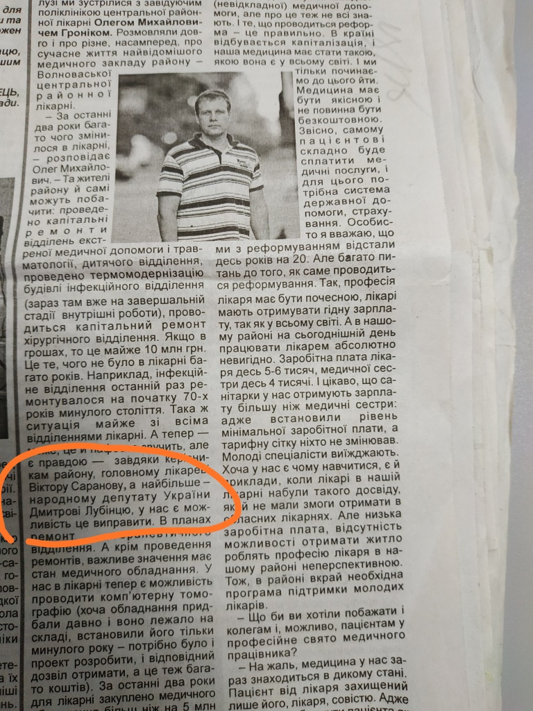 Декілька публікацій зі згадкою про самовисуванця по ОВК № 60 Дмитра Лубінця з’явились у червневому випуску волноваської газети. Жодних маркувань, тільки подяка за дитячий майданчик на території лікарняного відділення особисто Лубінцю, який є чинним народним депутатом і братиме участь у парламентських виборах. Ще дві згадки у тому ж випуску мають тональність подяки за ймовірне сприяння реалізації окремих проектів.
